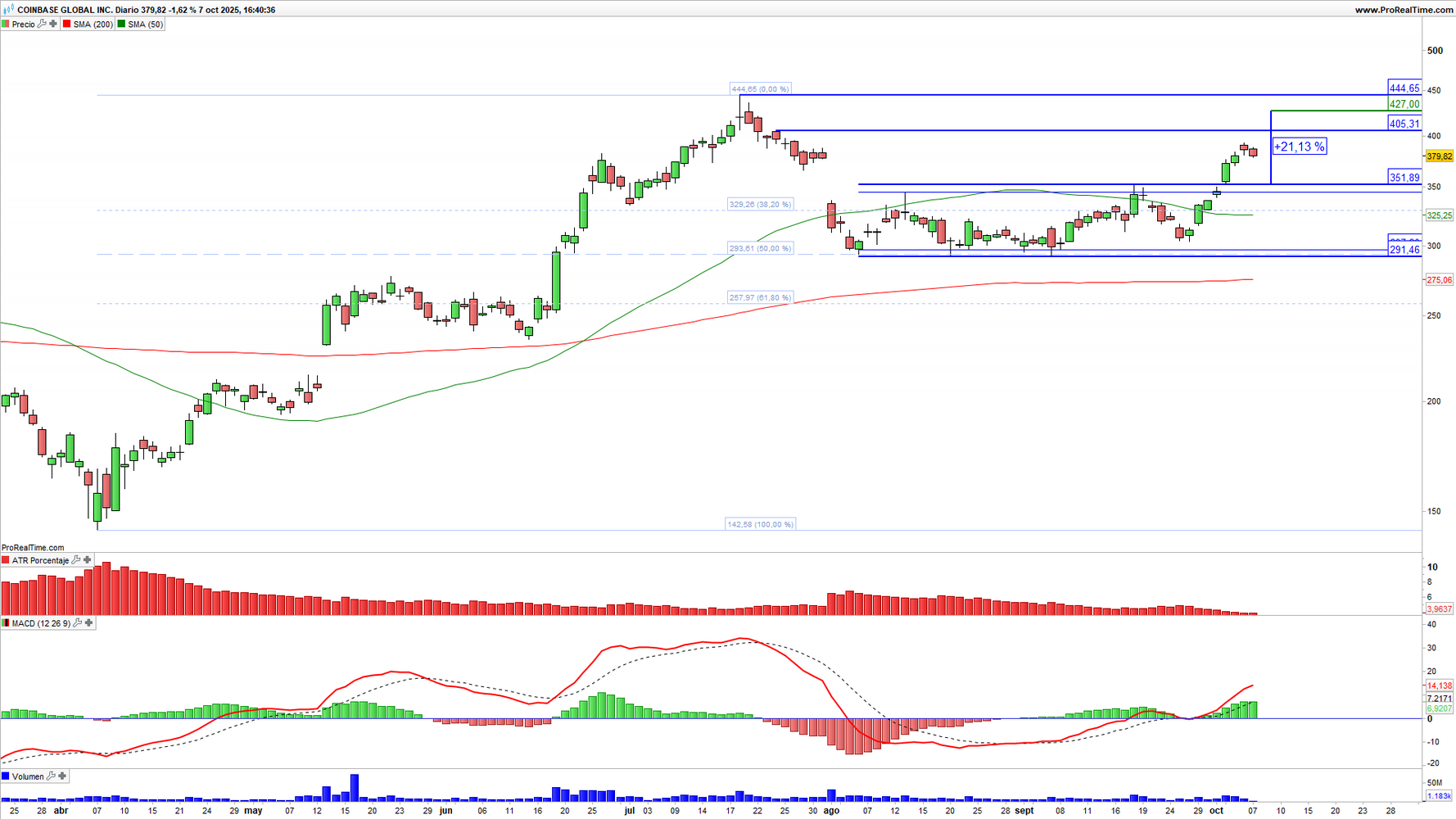 Coinbase (COIN) en escala diaria con volatilidad (gráfico central superior), MACD (gráfico central inferior) y actividad de contratación (ventana inferior). Fuente: ProRealTime y elaboración propia.
