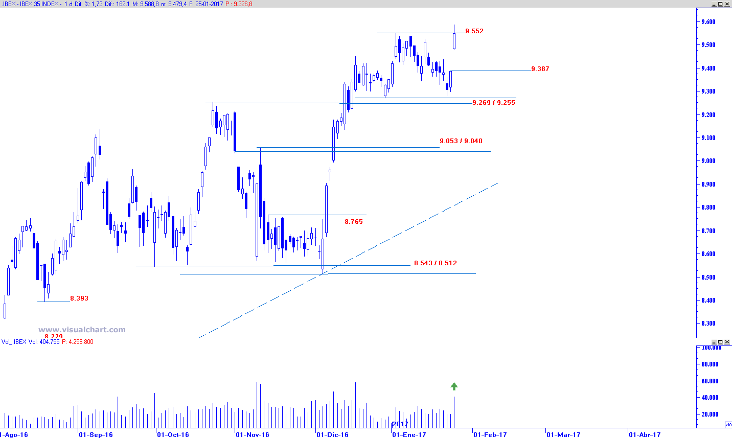 Sesión incuestionablemente en favor de las compras que, con un importante repunte en el volumen de contratación, la apertura de un amplio hueco alcista en los 9.387 puntos permite a los toros pasar a poner a prueba el área de soporte relevante de medio plazo de los 9.269 / 9.255 puntos a intentar superar la resistencia de los 9.552 puntos a lo largo de las últimas tres jornadas de cotización.
