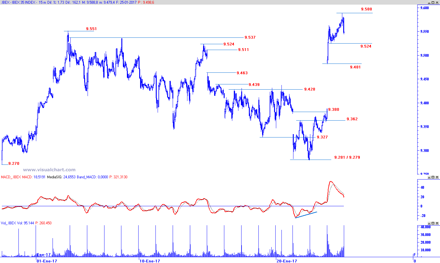 La fortaleza hoy ha sido tal que la consolidación tras la apertura de hoy queda establecida hasta los 9.524 puntos, punto a partir del cual el dinero ha vuelto a hacer acto de presencia y hemos visto un ascenso gradual en el precio de cotización hasta atacar, y superar temporalmente, los 9.552 puntos estableciendo un máximo de sesión situado en los 9.588 puntos. Al tiempo, el oscilador MACD mantiene su divergencia bajista que le permite normalizar sus lecturas de sobrecompra, sin inmutarse pese al goteo alcista vigente durante gran parte de la sesión.