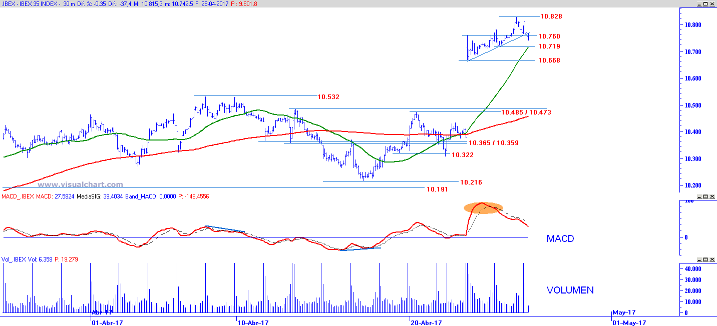 En gráfico a escala temporal de 30 minutos (ver imagen inferior), las ventas consiguen un mínimo avance por debajo de los 10.760 puntos que logra perforar la poco fiable tendencia alcista de las últimas sesiones de cotización, movimiento que podría verse beneficiado por la divergencia bajista localizada en el MACD y poner rumbo a los 10.719 puntos como soporte intermedio antes de atacar los 10.668 puntos, punto objetivo de las ventas.