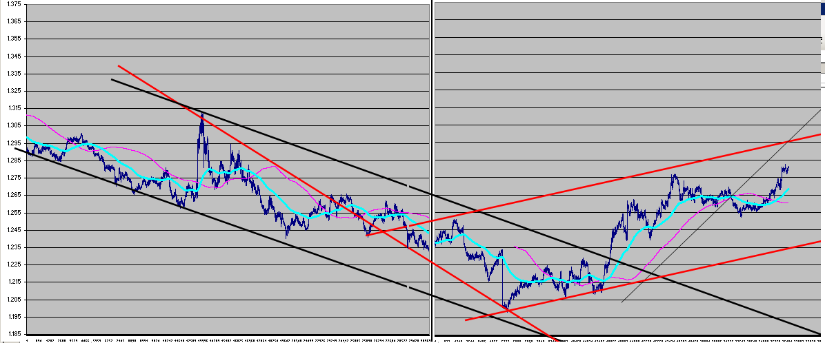 A la vista del comportamiento que está teniendo, parece probable que continúen las alzas hacia la parte superior de la formación en los 1.295 - 1.30, donde debería volver a consolidar. Por abajo, mientras no pierda la zona 1.26, y veamos un euro dólar por encima de los 1.2350, la tendencia alcista no debería peligrar.