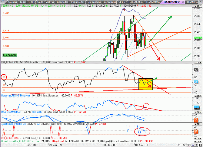 En realidad el Eurostoxx lleva ya 6 sesiones dentro de un rango estrecho, de apenas 100 puntos, entre 2360 y 2460. En las dos últimas sesiones se ha ido congestionando alrededor de la zona pivotal (2400), formando una figura de banderín. Este hecho, junto con las claras divergencias en los indicadores, presagian una ruptura violenta... ¿ pero en qué dirección ?