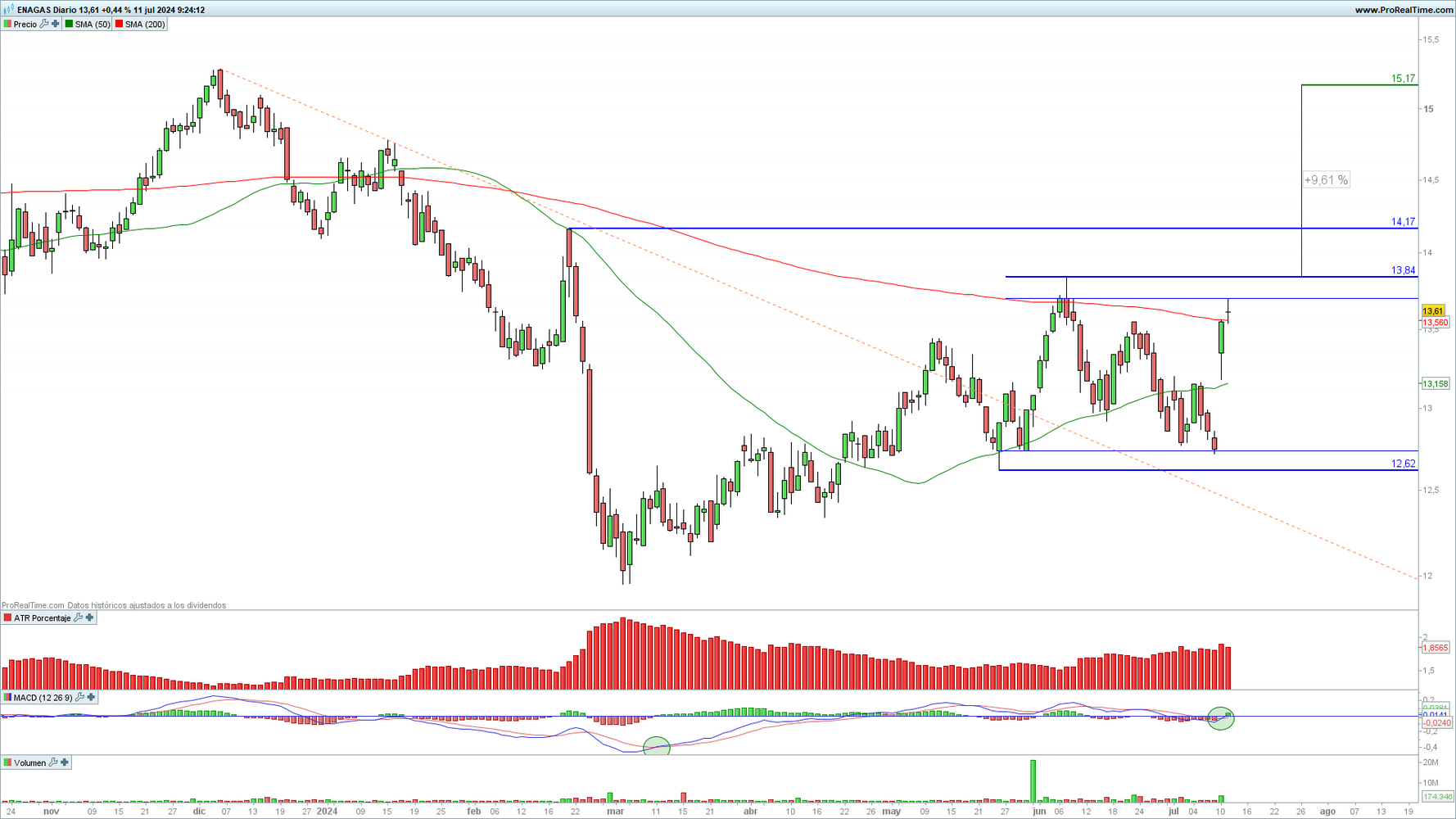 Enagás (ENG) en gráfico diario con Rango de amplitud medio en porcentaje (ventana superior) MACD (ventana central) y volumen de negociación (ventana inferior)