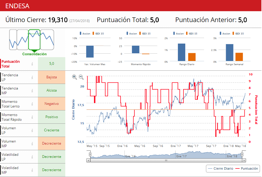 Endesa en gráfico diario con Rango de amplitud medio en porcentaje (ventana central superior), MACD (ventana central inferior) y volumen de contratación (ventana inferior)