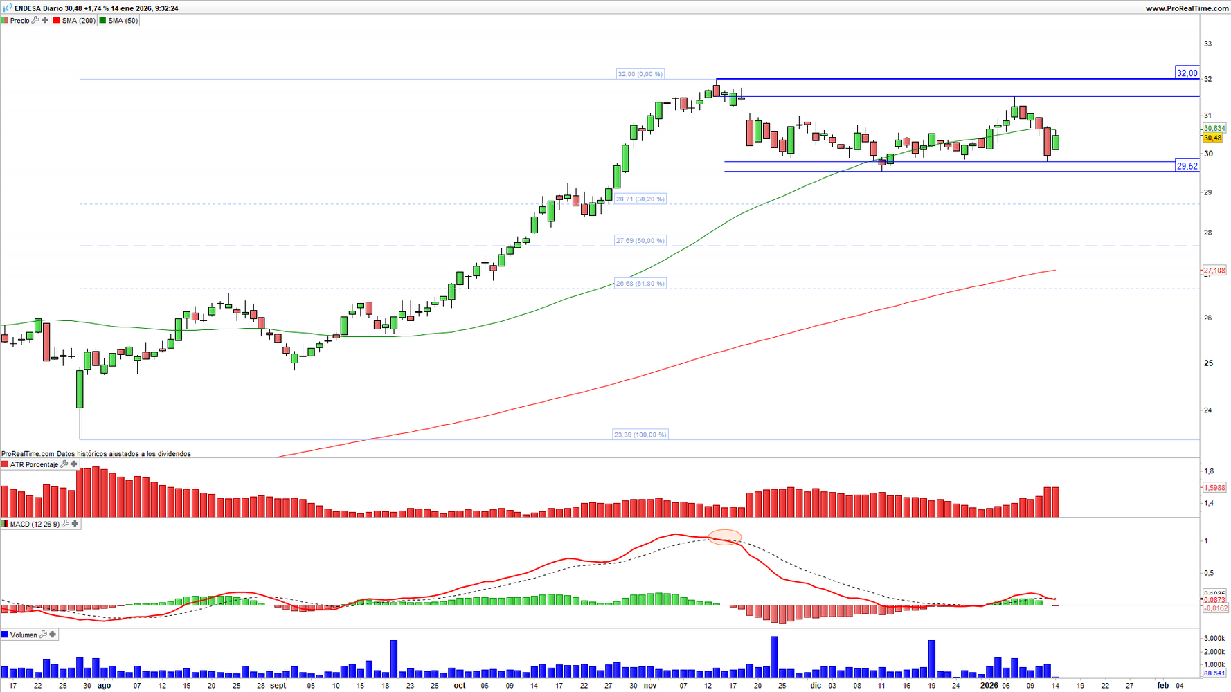 Endesa (ELE) en escala diaria con volatilidad (gráfico central superior), MACD (gráfico central inferior) y actividad de contratación (ventana inferior). Fuente: ProRealTime y elaboración propia.