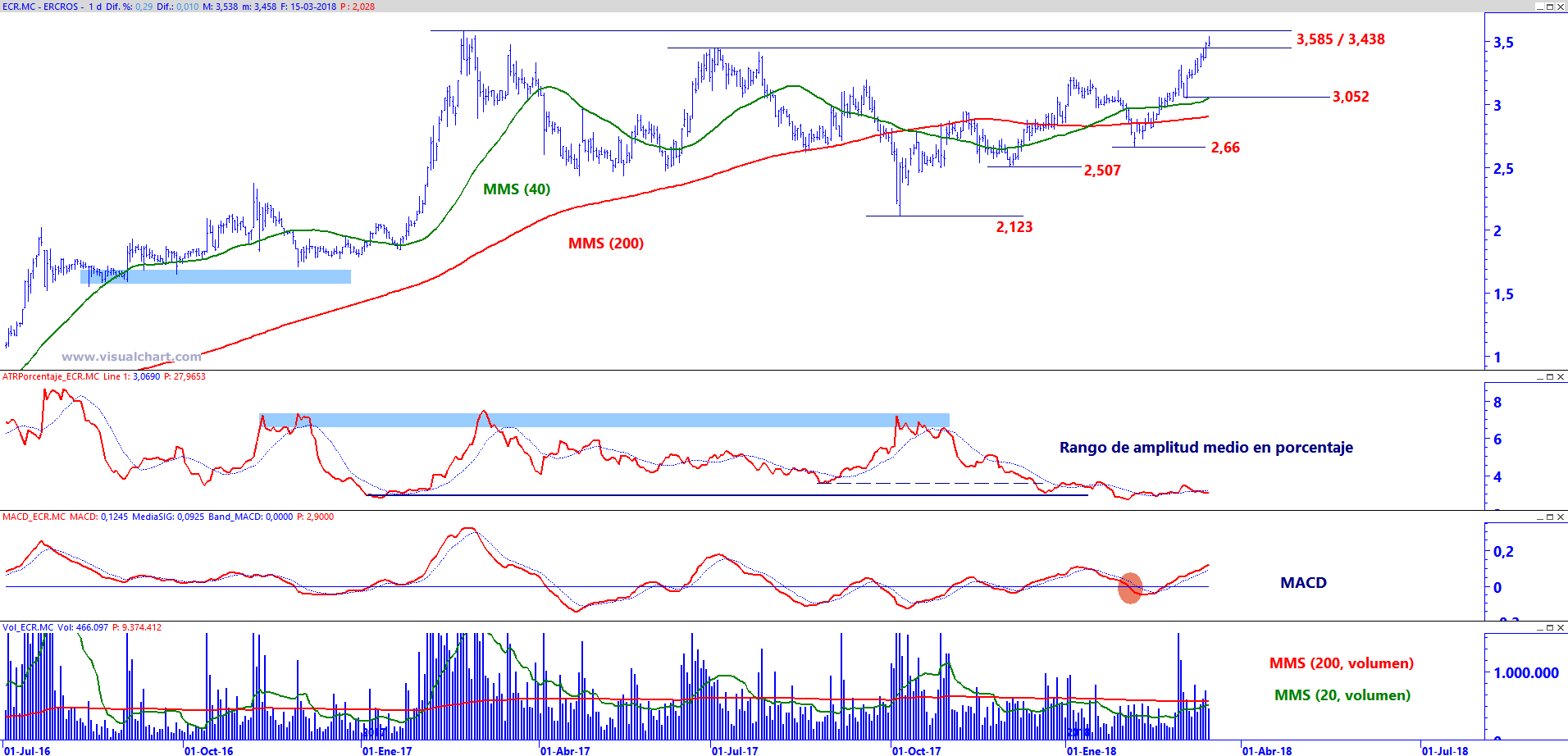 Ercros en gráfico diario con Rango de amplitud medio en porcentaje (ventana central superior), MACD (ventana central inferior) y volumen de contratación (ventana inferior)