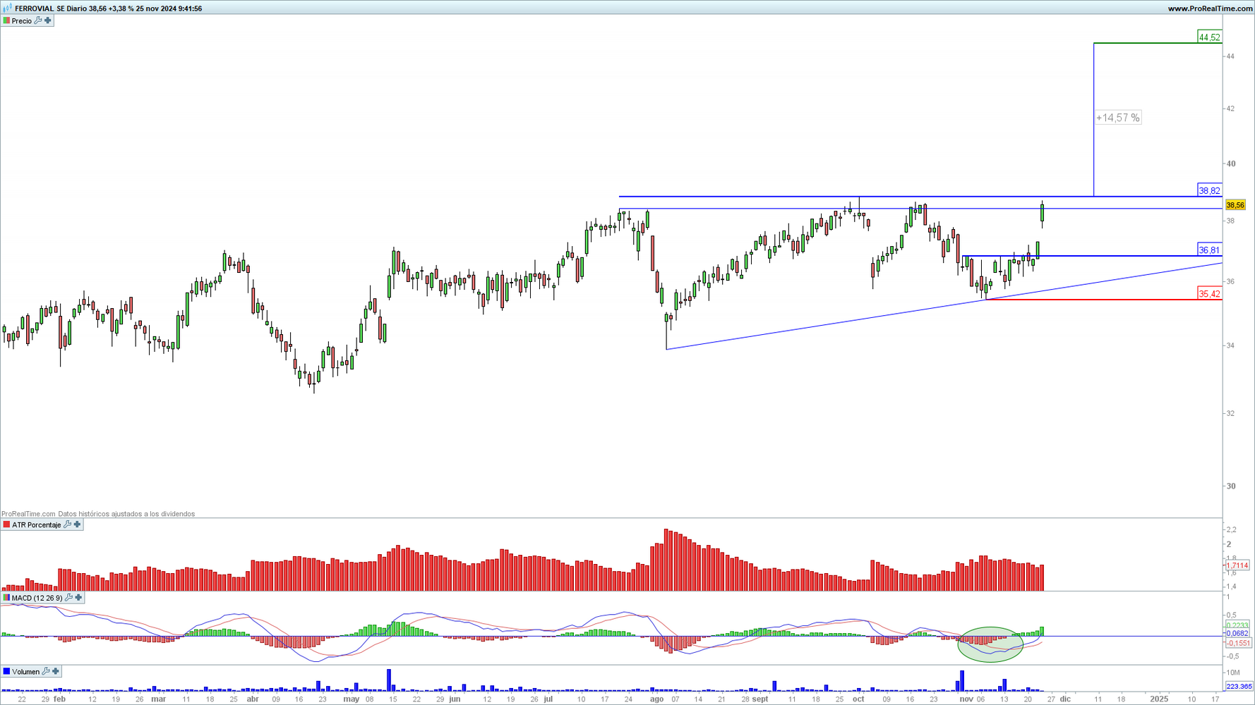 Ferrovial (FER) en gráfico diario con Rango de amplitud medio en porcentaje (ventana superior) MACD (ventana central) y volumen de negociación (ventana inferior)
