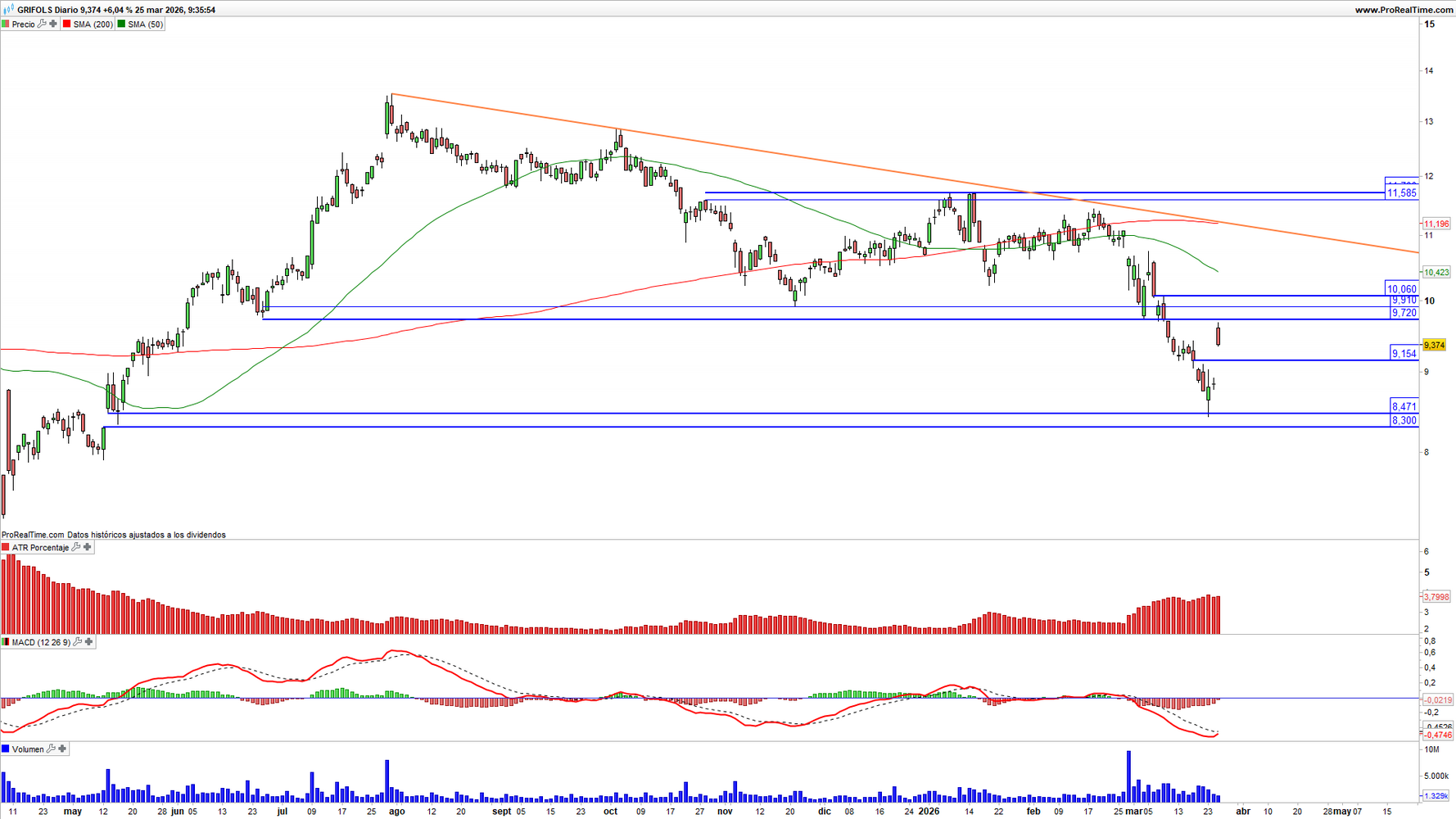 Grifols (GRF) en escala diaria con volatilidad (gráfico central superior), MACD (gráfico central inferior) y actividad de contratación (ventana inferior). Fuente: ProRealTime y elaboración propia.