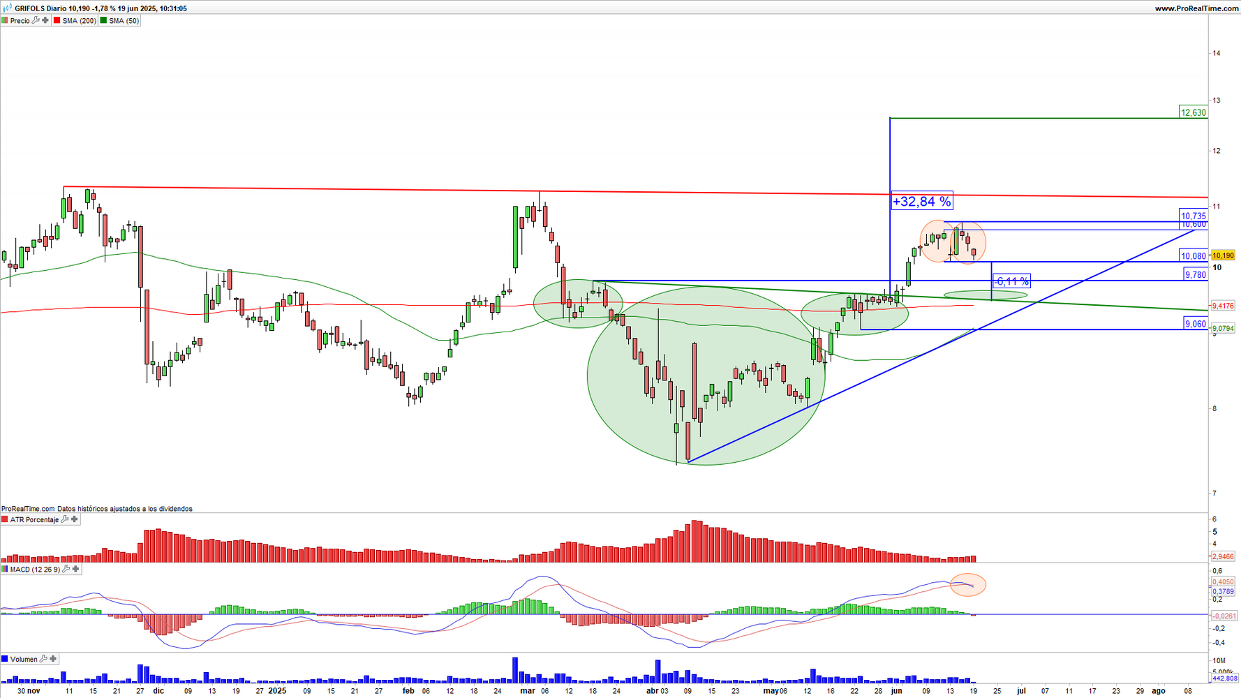 La cotización de Grifols se encuentra a las puertas de producir un tramo de consolidación de las subidas producidas desde los mínimos del pasado mes de abril. De este modo, el activo podría iniciar un tramo de consolidación si se produce un cierre diario por debajo de los 10,08€ por acción, pudiendo producir un tramo a la baja a la partir de la perforación de dicho nivel de soporte.