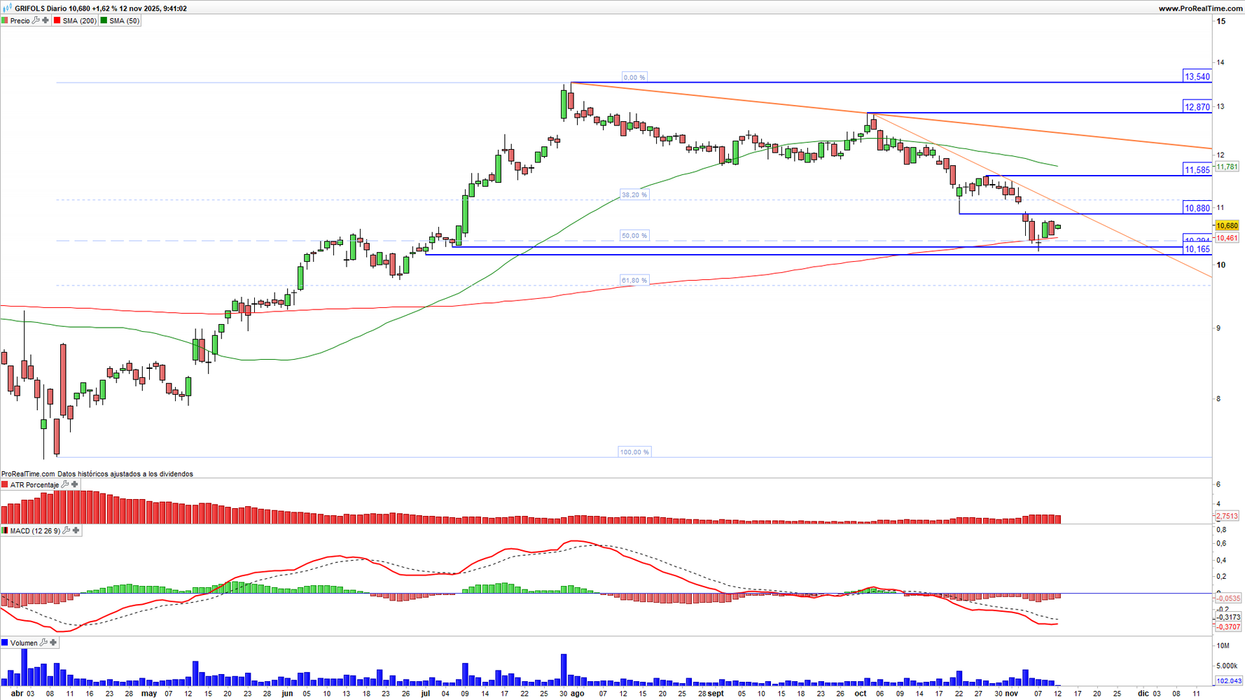 La cotización de Grifols registra un comienzo de sesión positivo con subidas superiores al 1,62%. En este sentido, el precio se encuentra produciendo apoyos sobre zonas de soporte siendo importante producir la superación de los 10,88€ por acción para poder iniciar un rebote durante las próximas sesiones que confirme los soportes encontrados.