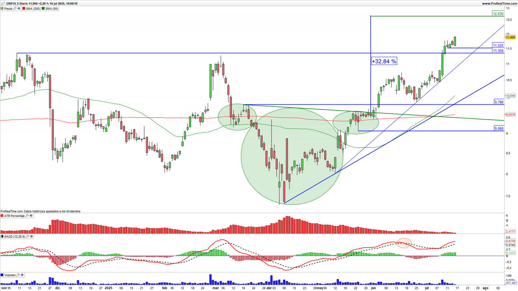 La cotización de Grifols ha producido importantes avances durante las últimas semanas, siendo el activo que mejor comportamiento ha tenido en el Ibex35. En este sentido, en la sesión del pasado 29 de mayo presentábamos en estrategias de inversión la activación de un importante objetivo alcista en Grifols con un potencial de subida del 32,84% y, desde ese momento, el activo ha producido subidas del 23,49%, de modo que, continuamos manteniendo activo el principal objetivo alcista en las inmediaciones de los 12,71€ por acción.