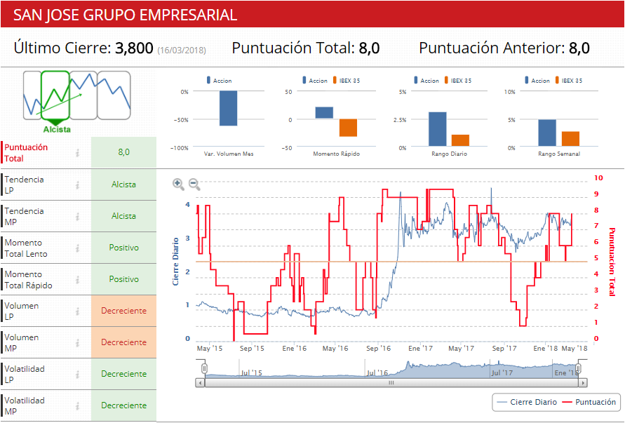 Grupo San Josédesarrolla un contundente impulso al alza a partir del mínimo creciente de los 3,465 que permite a la curva de precios superar resistencias relevantes como son; (1) la directriz que une máximos decrecientes iniciada a partir de los máximos anuales y (2) los máximos relativos precios de los 3,94. Este movimiento en favor de las compras se registra con un respaldo por parte del volumen de contratación y la activación de señales de compra de medio plazo en el oscilador MACD, todo ello, en un entorno de volatilidad normalizada.