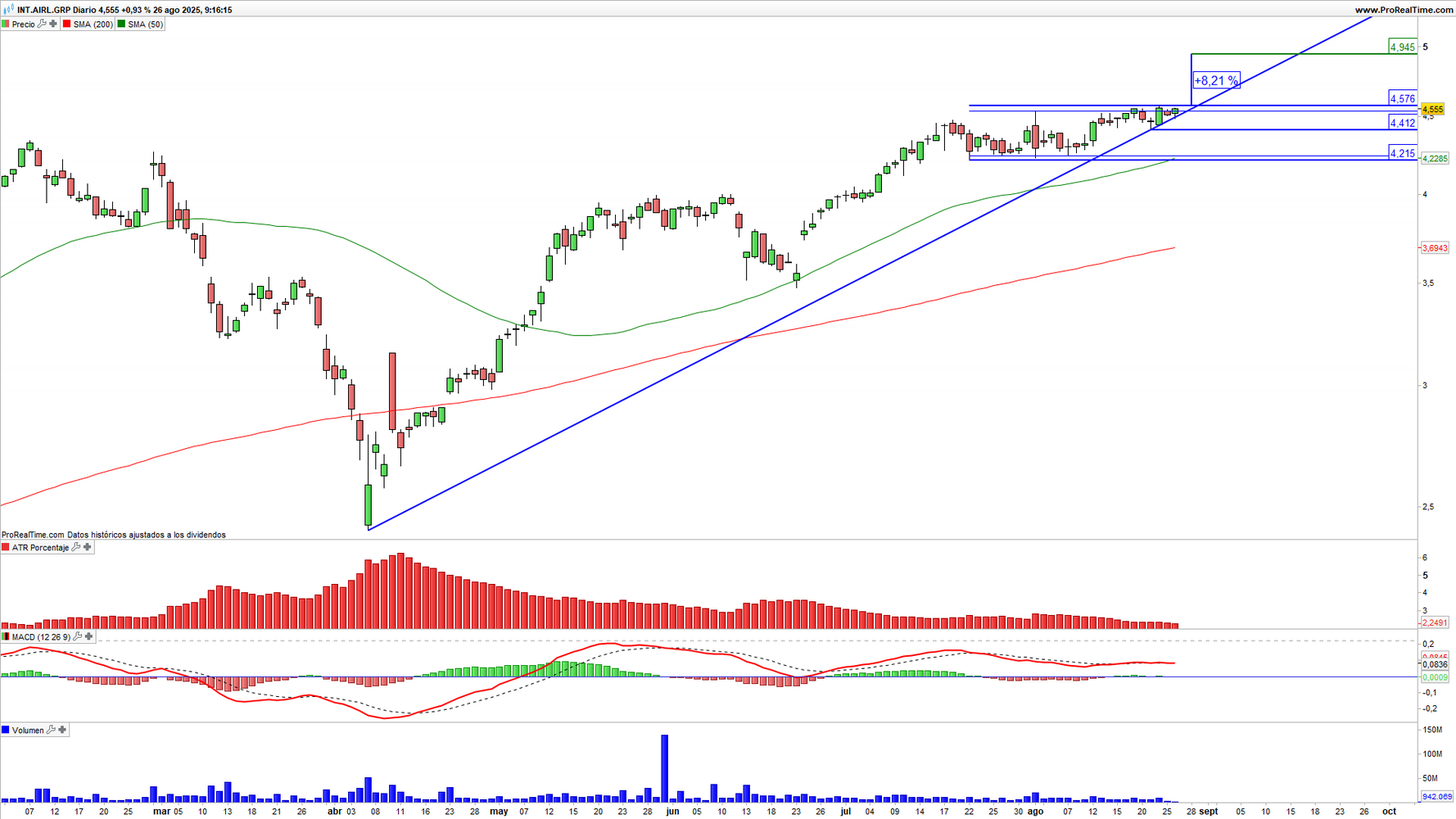 IAG (IAG) en escala diaria con volatilidad (gráfico central superior), MACD (gráfico central inferior) y actividad de contratación (ventana inferior). Fuente: ProRealTime y elaboración propia.