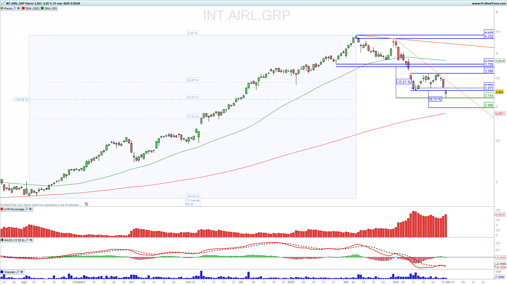 IAG (IAG) en escala diaria con volatilidad (gráfico central superior), MACD (gráfico central inferior) y actividad de contratación (ventana inferior). Fuente: ProRealTime y elaboración propia.