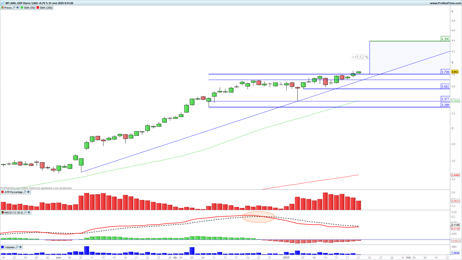IAG (IAG) en gráfico diario con Rango de amplitud medio en porcentaje (ventana superior) MACD (ventana central) y volumen de negociación (ventana inferior)