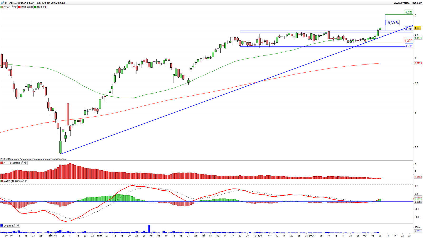 La cotización de IAG continúa comportándose como uno de los activos más fuertes del mercado español tras asistir a nuevas subidas en la jornada de hoy que producen el registro de nuevos máximos anuales. Además, los niveles de sobrecompra se han neutralizado durante las últimas sesiones, permitiendo con ello que las acciones de IAG vuelvan a tener margen para producir subidas en las próximas sesiones.