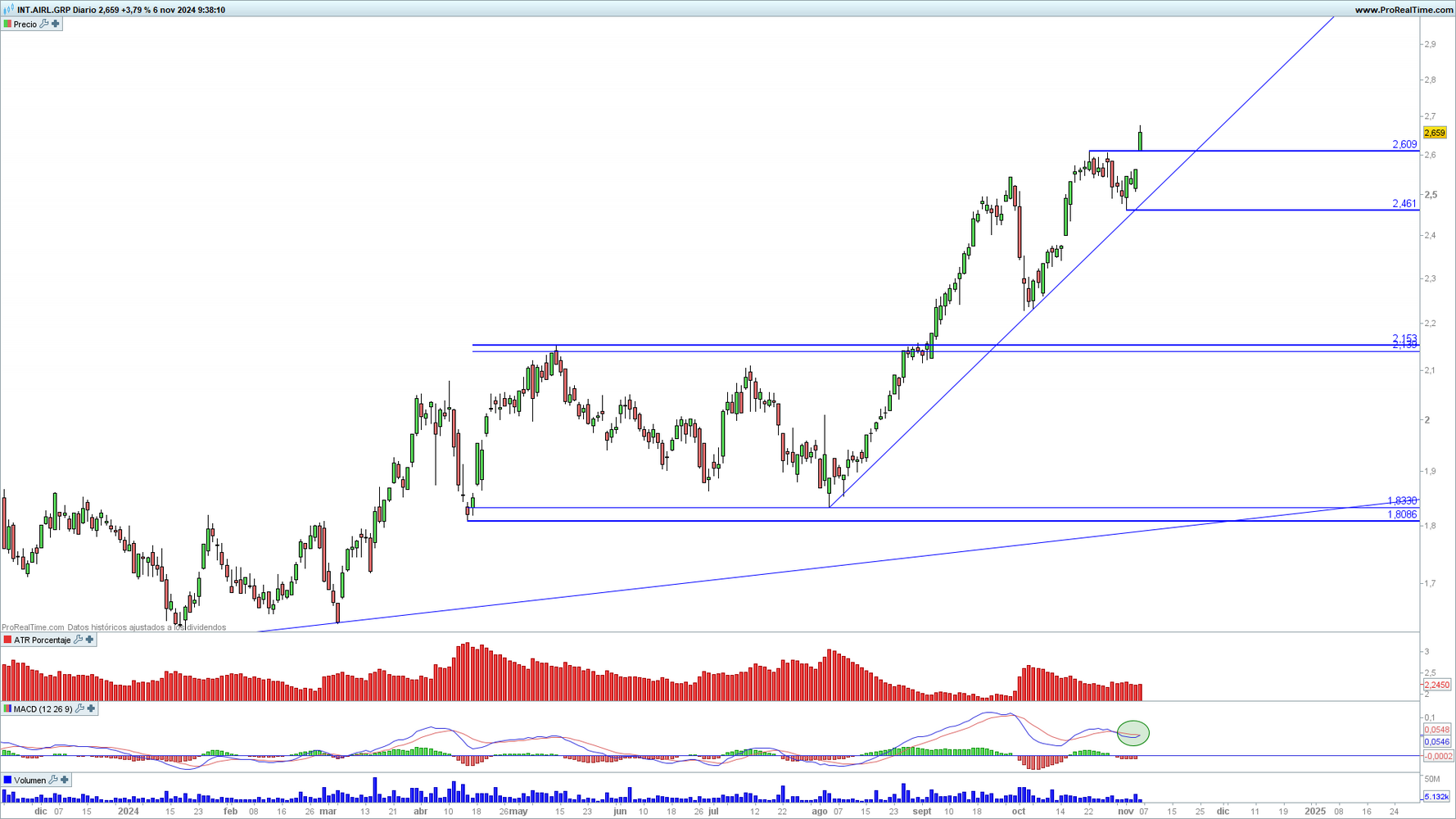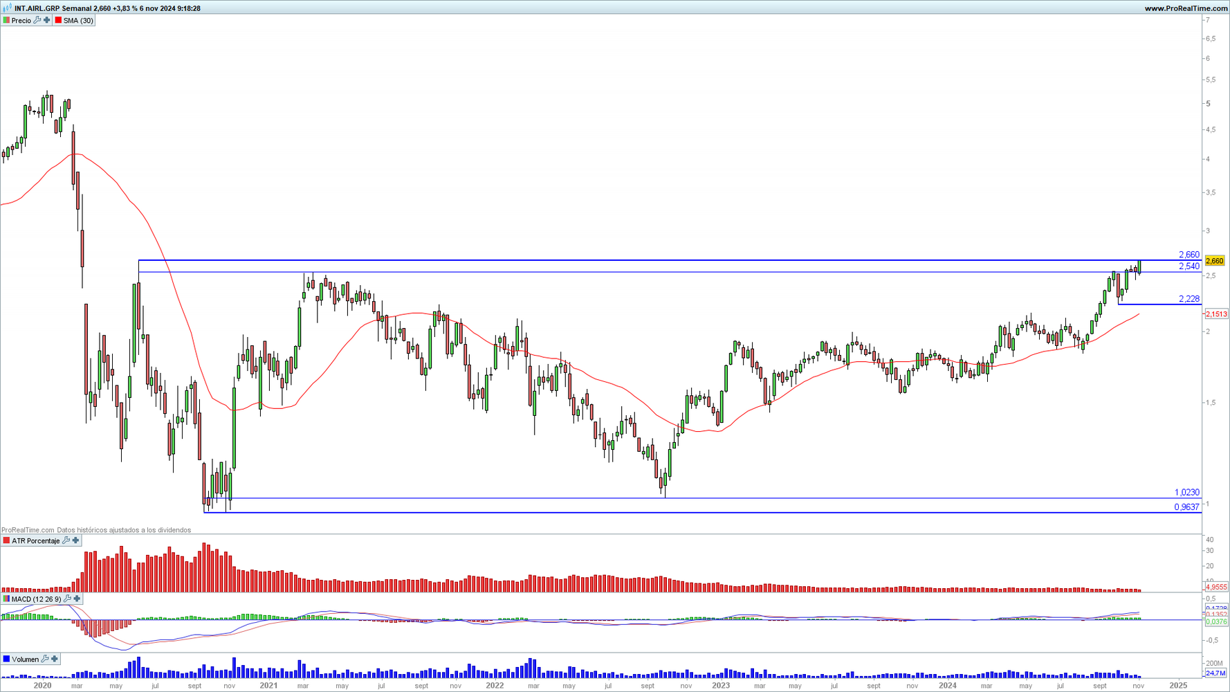 La cotización de IAG continúa comportándose como uno de los valores más fuertes del Ibex35. En este sentido, en los primeros minutos de la sesión de hoy miércoles día 6 de noviembre, IAG arranca con subidas del 4% aproximadamente, produciendo nuevos máximos anuales. Además, la cotización se encuentra atacando un nivel de resistencia muy relevante, por lo que la tendencia alcista puede tener continuidad en las próximas sesiones/semanas.