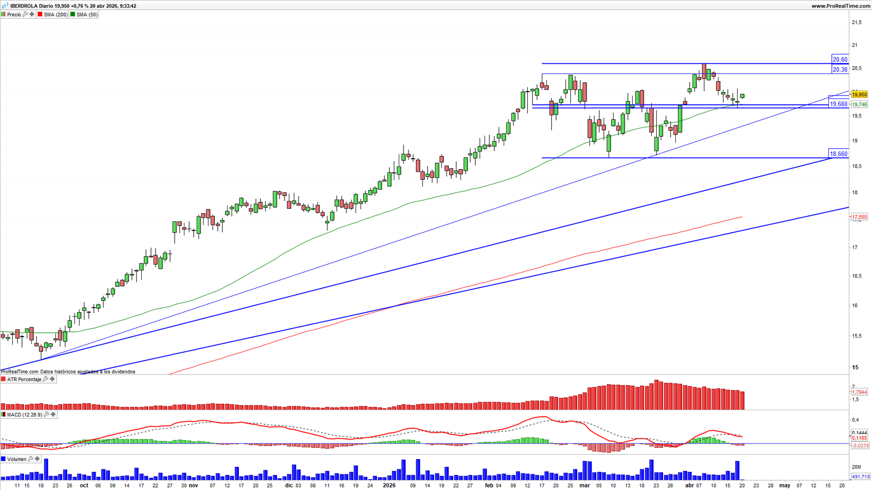 La cotización de Iberdrola arranca la semana registrando subidas del 0,75% en estos momentos secundada por las alzas que se registran en las compañías energéticas tras el ataque de Estados Unidos contra un buque iraní cerca de Ormuz. De este modo, el precio está encontrando apoyos apoyos en el entorno de los 19,66€ por acción siendo esté nivel de precios un área de relevancia técnica, por lo que si no asistimos a cierres diarios por debajo de esta cota de precios la cotización de Iberdrola podría volver a aproximarse al entorno de los máximos anuales sobre los 20,60€ por acción.