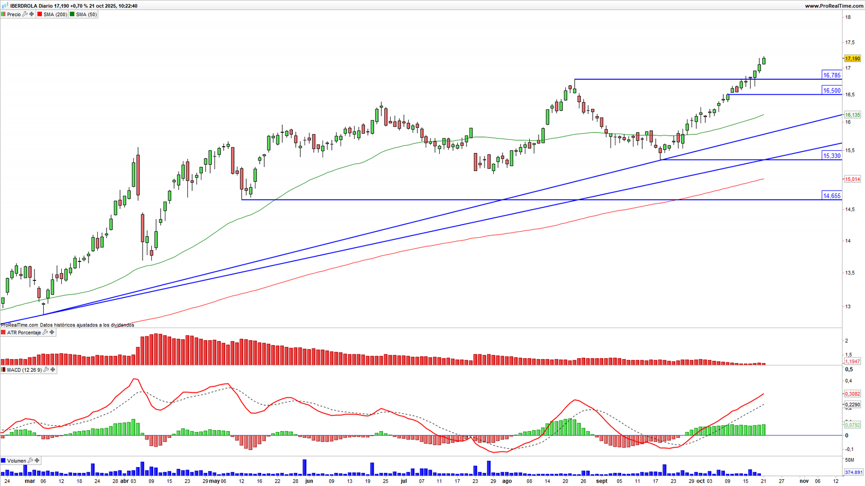 Iberdrola (IBE) en escala diaria con volatilidad (gráfico central superior), MACD (gráfico central inferior) y actividad de contratación (ventana inferior). Fuente: ProRealTime y elaboración propia.