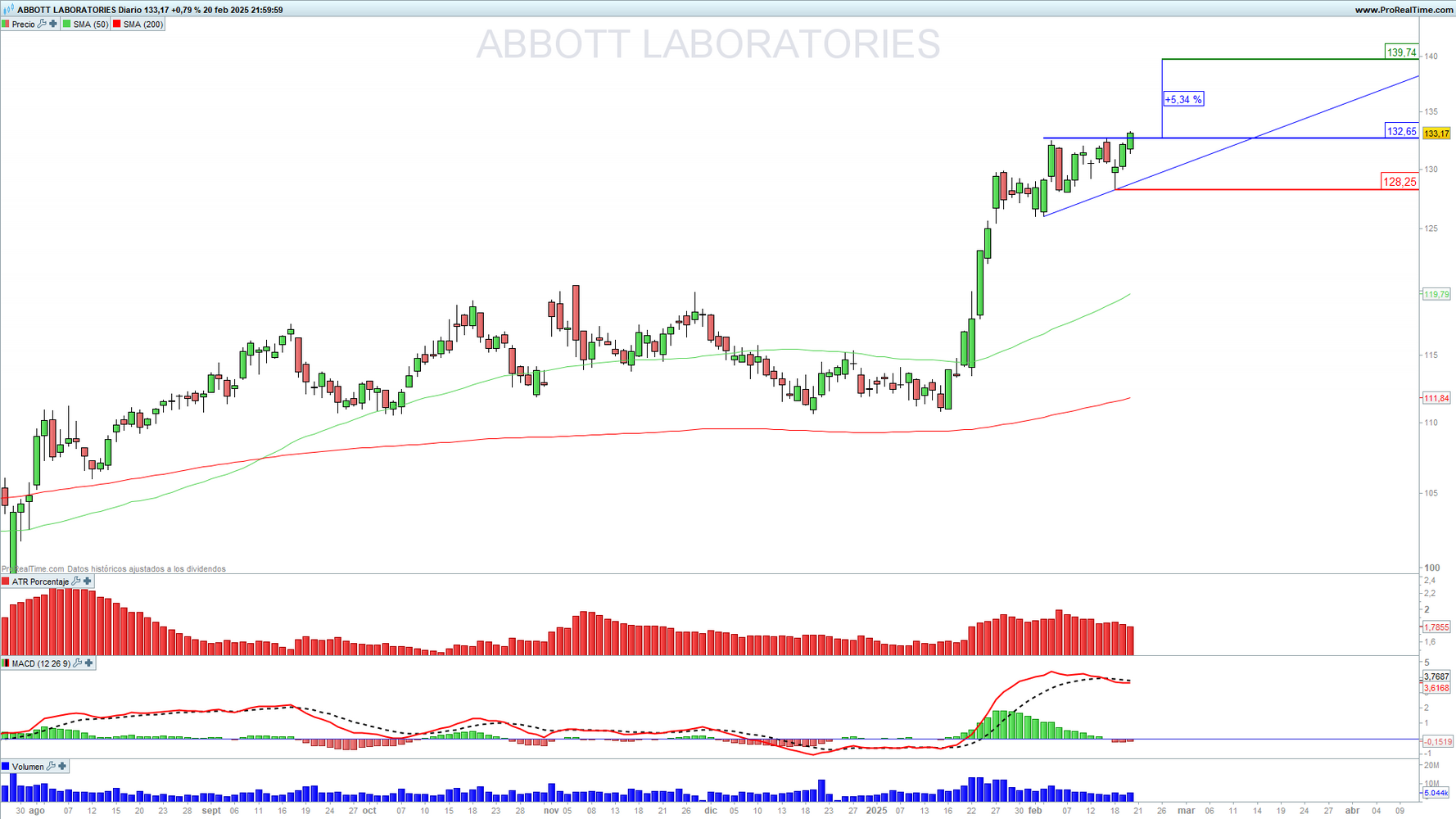 Abbott Laboratories (ABT) Ha producido durante los últimos meses un fuerte movimiento alcista en su precio durante las últimas sesiones. En este sentido, a pesar de las fuertes subidas producidas, el precio ha completado la formación de una figura chartista de continuación de tendencia en forma de triángulo ascendente, de modo que, a partir de los 132,66$ por acción, se pueden iniciar posiciones en largo o de compras, con un objetivo alcista a trabajar en la cota de los 139,74$ por acción, con un porcentaje de subida del 5,34% aproximadamente.