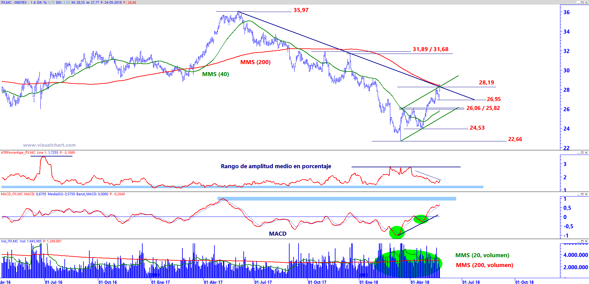 Inditex en gráfico diario con Rango de amplitud medio en porcentaje (ventana central superior), MACD (ventana central inferior) y volumen de contratación (ventana inferior)