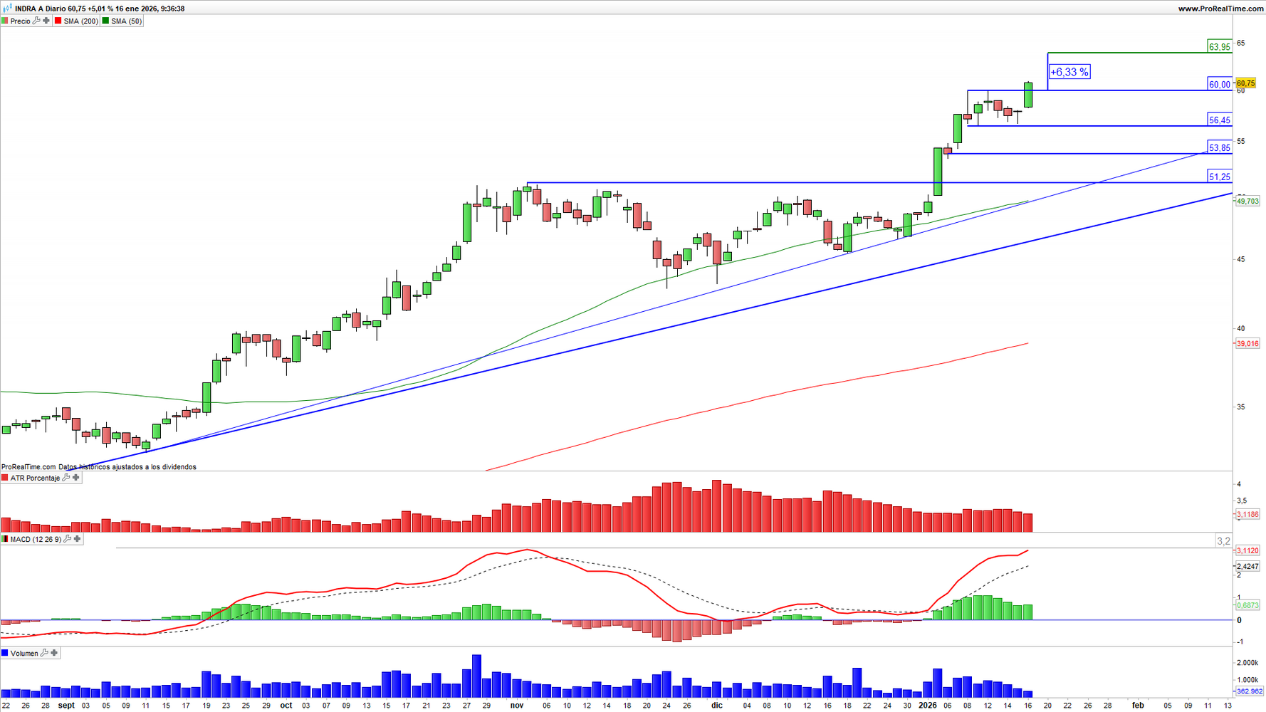 En el gráfico diario de Indra (IDR), detectamos que tras las noticias conocidas en la jornada de hoy el precio vuelve a completar el registro de nuevos máximos históricos y activa un objetivo alcista tras producir la ruptura de un rango lateral comprendido entre los 56,45 y los 60,00€ por acción. Este objetivo alcista lo proyectamos en el entorno de los 63,95€ por acción. No obstante, el oscilador MACD continua extendiendo las ya abultadas lecturas de sobrecompra, por lo que estas lecturas pueden ser purgadas a lo largo de las próximas sesiones / semanas, por lo que la dificultad de este objetivo alcista se antoja elevada debido a la saturación por parte de las compras durante las últimas semanas con las fuertes subidas que se están produciendo. Por tanto, mantendremos activo este objetivo alcista siempre que no asistamos a cierres diarios por debajo de los 56,45€ por acción debido a que la ruptura de este soporte puede llevar al precio a registrar apoyos sobre las cercanías de la media móvil simple de 50 sesiones (línea verde).
