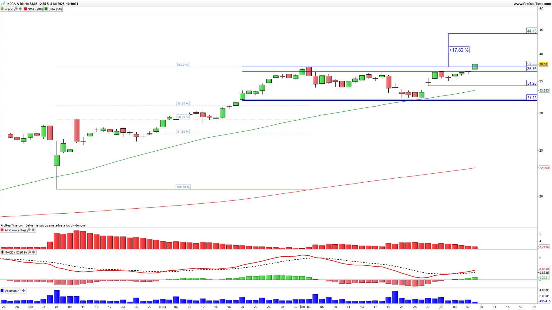 Bajo esta premisa, mantendremos una visión positiva para las acciones de Indra mientras no asistamos a un cierre diario por debajo de los 34,23€ por acción, prestando especial atención a lo largo de la sesión de hoy en la búsqueda de completar el cierre diario por encima de los 37,56€ por acción.