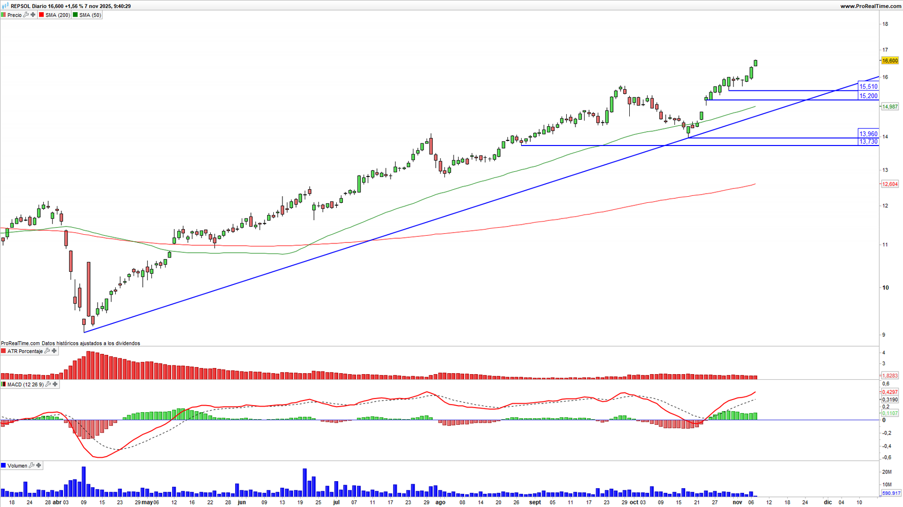 Repsol (REP) en escala diaria con volatilidad (gráfico central superior), MACD (gráfico central inferior) y actividad de contratación (ventana inferior). Fuente: ProRealTime y elaboración propia.