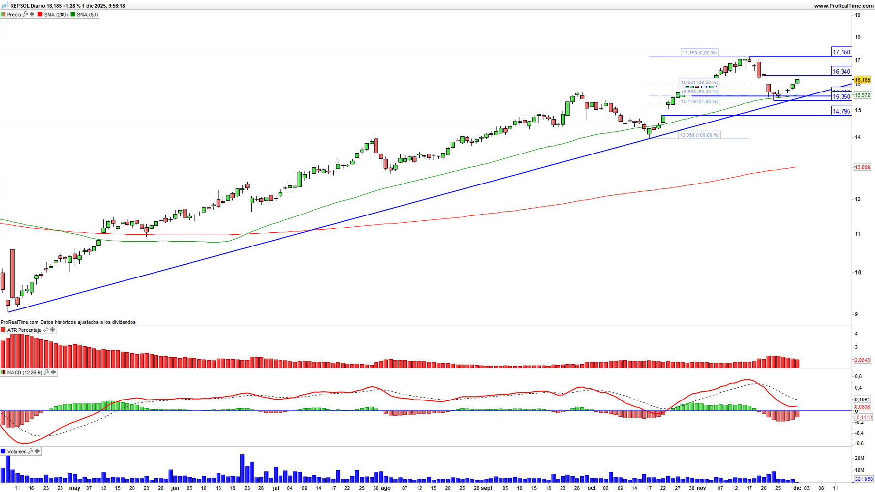 La cotización de Repsol arranca la semana liderando las subidas en el Ibex35, con subidas que superan el 1,25%. En este sentido, la compañía se ve beneficiada por subidas en el precio Brent que se encamina al 2% en el arranque de la semana, por lo que las compras tienen como objetivo principal cerrar un importante Gap o hueco bajista en las inmediaciones de los 16,34€ por acción.