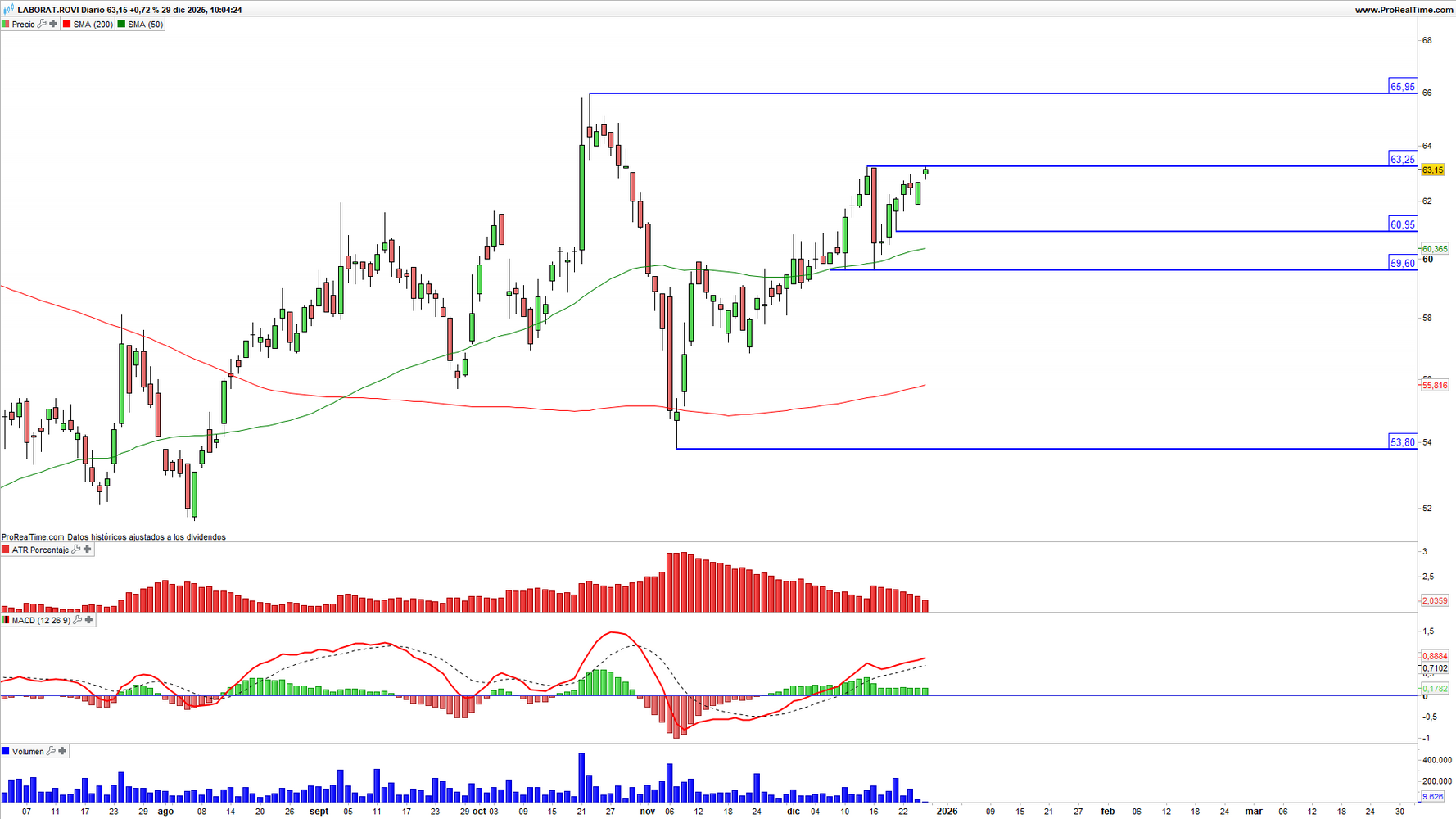 La cotización de Laboratorios Rovi inicia la última jornada de lunes del año 2025 atacando importantes niveles de resistencia con subidas superiores al 0,5%. De este modo, podemos estar ante un rally en las acciones de Laboratorios Rovi si el precio consigue producir un cierre diario por encima de los 63,25€ por acción.
