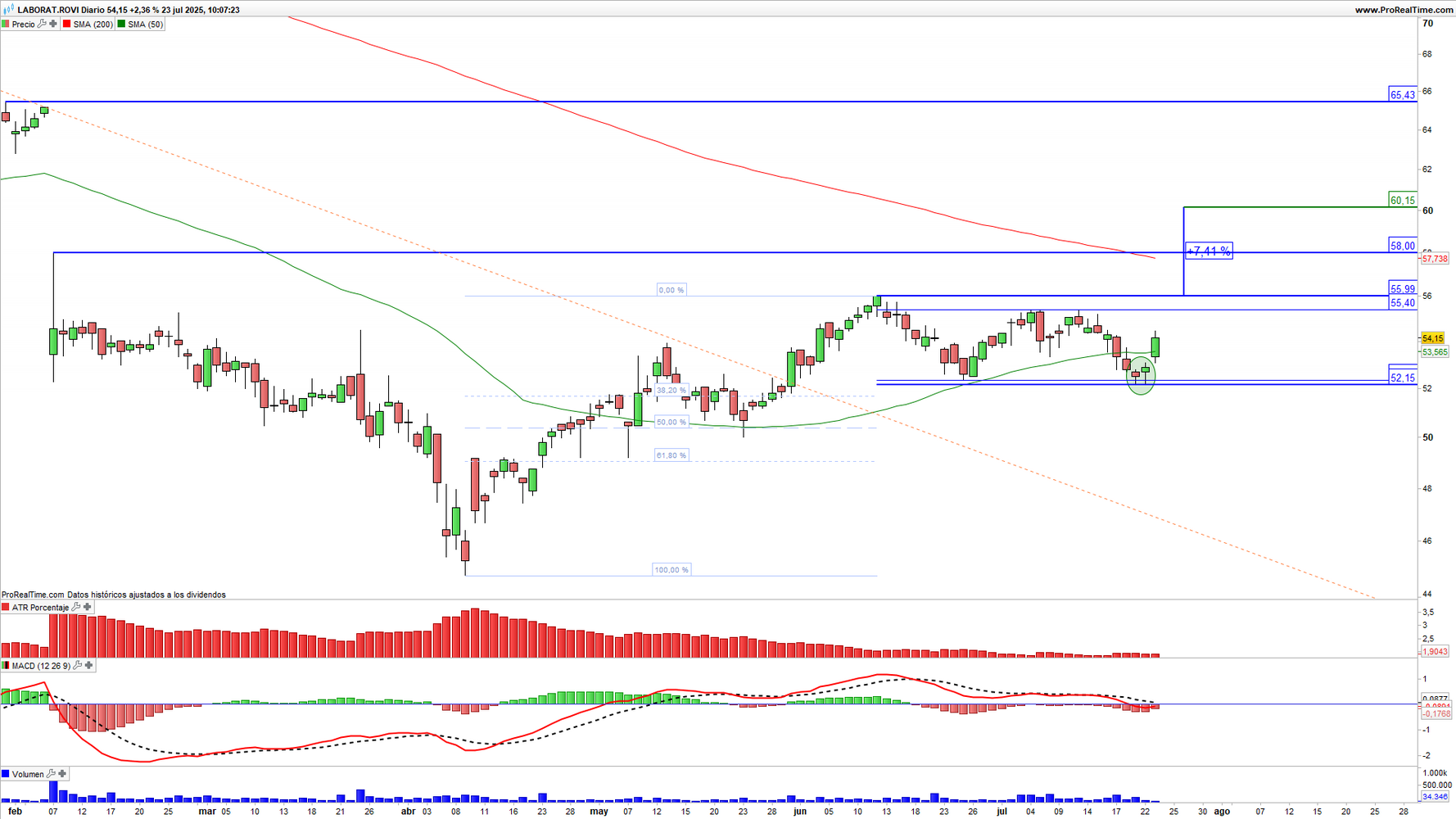 La cotización de Laboratorios Rovi lidera las subidas en el Ibex35 en la sesión de hoy miércoles día 23 de julio, con subidas que rondan el 2,35% en estos momentos. En este sentido, el activo se encuentra con un aspecto técnico interesante, siendo el escenario más probable que podamos asistir a la activación de un objetivo alcista durante las próximas sesiones.