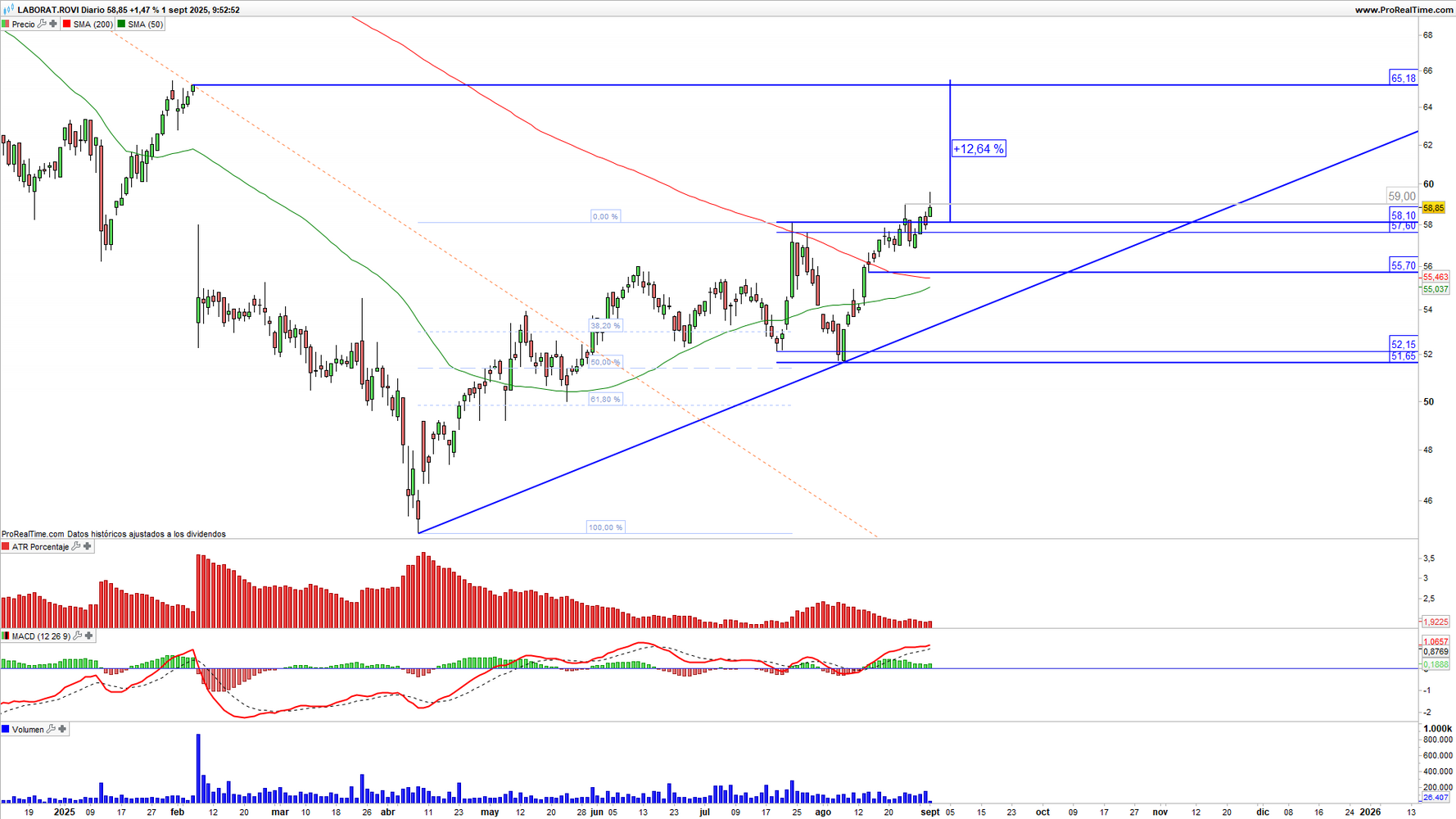 Laboratorios Rovi (ROVI) en escala diaria con volatilidad (gráfico central superior), MACD (gráfico central inferior) y actividad de contratación (ventana inferior). Fuente: ProRealTime y elaboración propia.