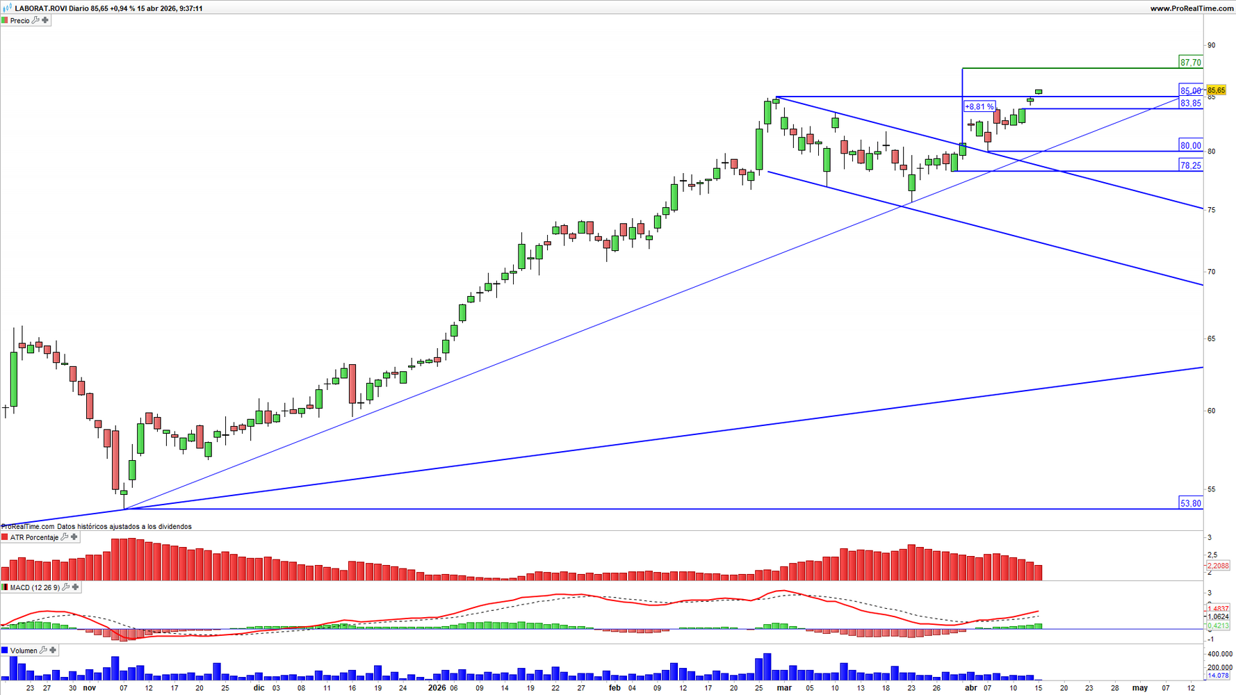 Laboratorios Rovi (ROVI) en escala diaria con volatilidad (gráfico central superior), MACD (gráfico central inferior) y actividad de contratación (ventana inferior). Fuente: ProRealTime y elaboración propia