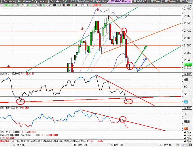Como no puede ser menos, los market makers no desaprovecharon la ocasión, eso sí, ocultando sus intenciones hasta el último momento: durante el principio de semana dibujaron un banderín alcista (patrón que en tendencia alcista suele romper por arriba), e incluso simularon en la apertura de ayer una falsa ruptura del banderín y de la resistencia de 2420. Finalmente rompieron el banderín por abajo, en 2380, y bajaron directamente dos niveles de soporte, hasta el 2320, y muy cerca ya de la base del canal alcista (marcado en verde).