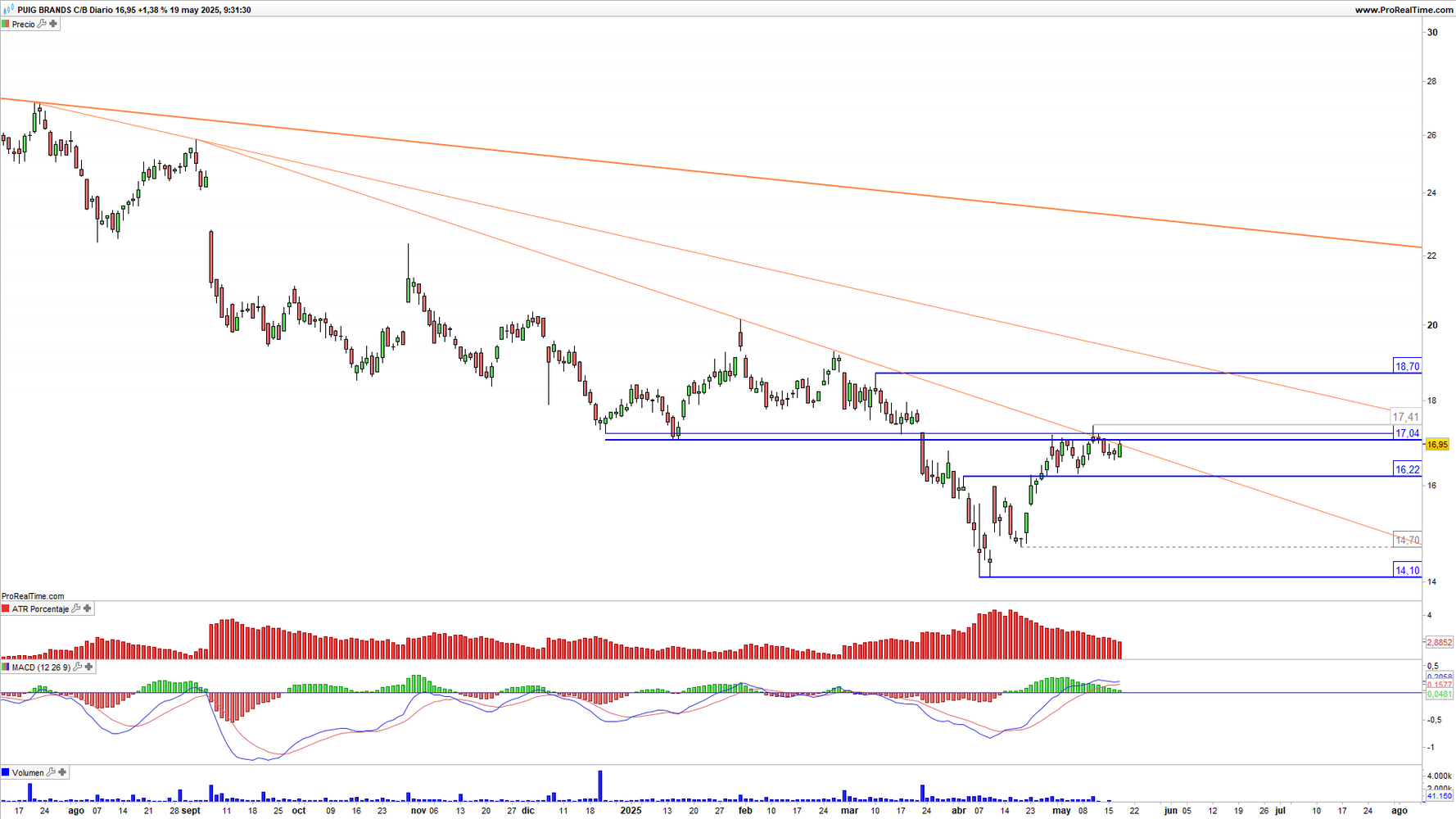 Puig Brands (PUIG) en gráfico diario con Rango de amplitud medio en porcentaje (ventana superior) MACD (ventana central) y volumen de negociación (ventana inferior)