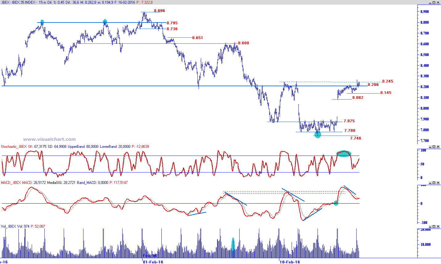 Apertura con signo positivo la de hoy martes día 16 de FEB16 en los grandes índices europeos, avances que oscilan entre leves y moderados que, en ningún caso, llegan a alcanzar el +1%, dato relevante tras varias jornadas de locura en las que lo habitual era no moverse menos de un +/-1%. Nuestro selectivo IBEX 35 bajo estudio abre ligeramente en positivo con alzas del +0,20% y ataca desde primera hora la zona clave de resistencia en torno a los 8.245-8.206 puntos, aunque por el momento, sin demasiado éxito.
