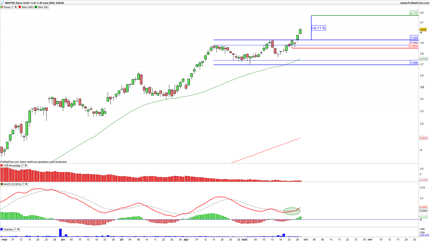 Mapfre (MAP) en escala diaria con volatilidad (gráfico central superior), MACD (gráfico central inferior) y actividad de contratación (ventana inferior). Fuente: ProRealTime y elaboración propia.