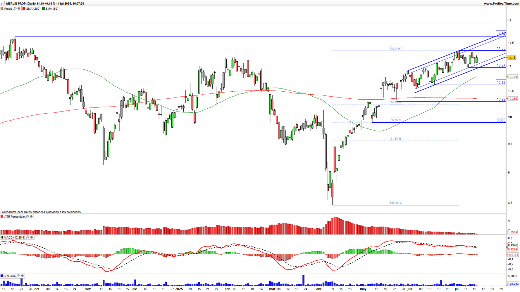 Merlin Properties (MRL) en escala diaria con volatilidad (gráfico central superior), MACD (gráfico central inferior) y actividad de contratación (ventana inferior). Fuente: ProRealTime y elaboración propia.