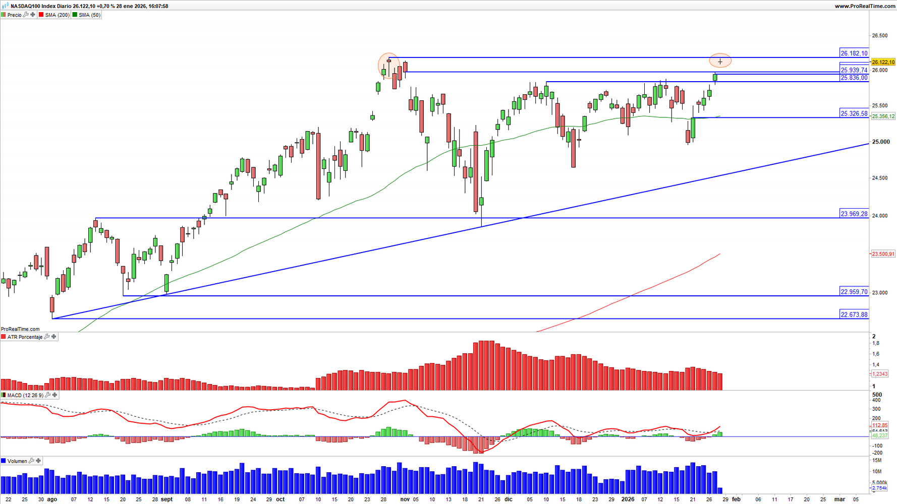 Nasdaq 100 (NDX) en escala diaria con volatilidad (gráfico central superior), MACD (gráfico central inferior) y actividad de contratación (ventana inferior). Fuente: ProRealTime y elaboración propia.