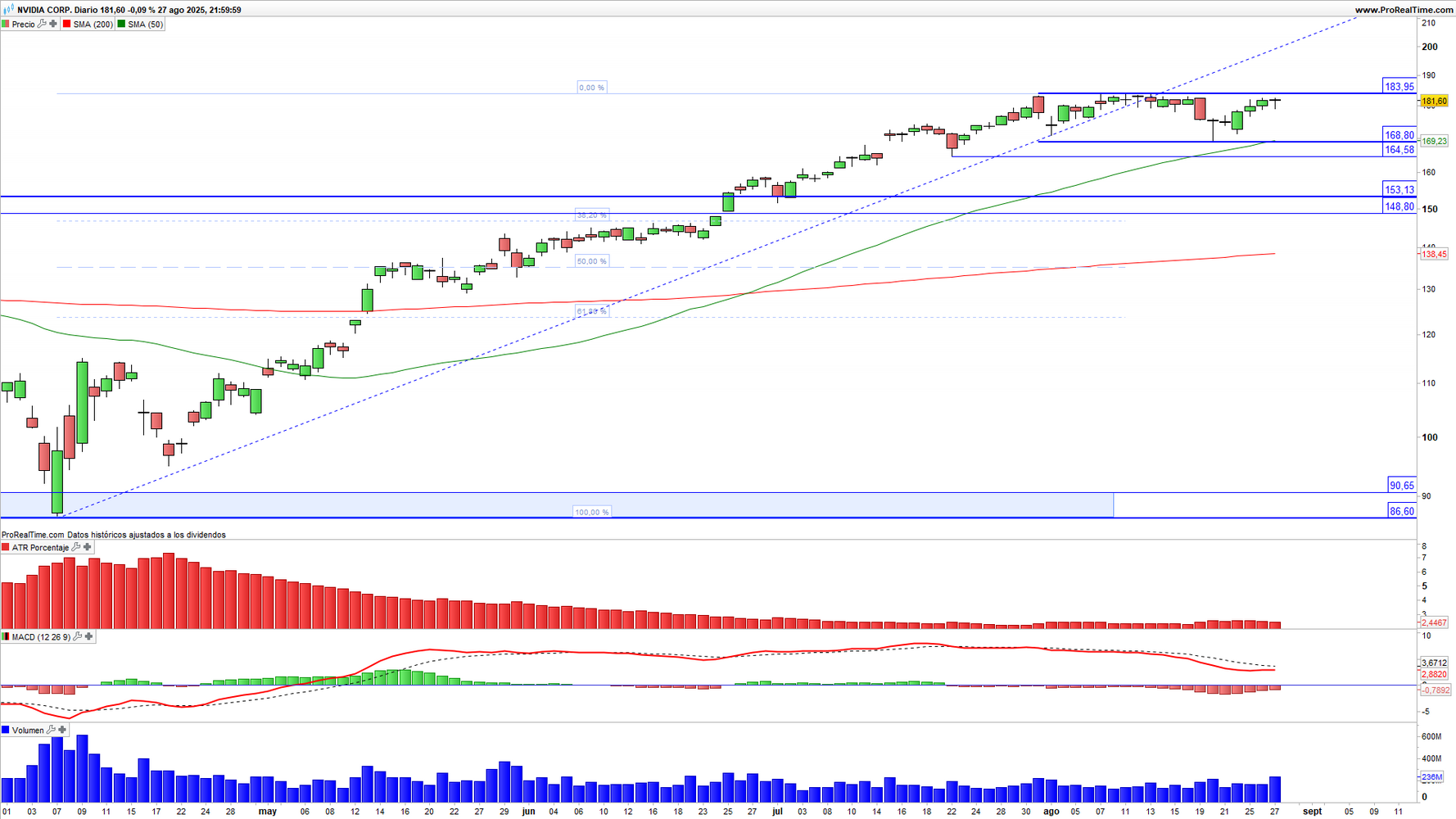 De este modo, mantendremos la actitud constructiva en las acciones de Nvidia mientras no asistamos a un precio de cierre diario por debajo de los 168,80$ por acción, puesto que, si asistimos a la perforación de este nivel, los vendedores podrían hacerse de nuevo con el control del activo, neutralizando con ello el escenario positivo proyectado.