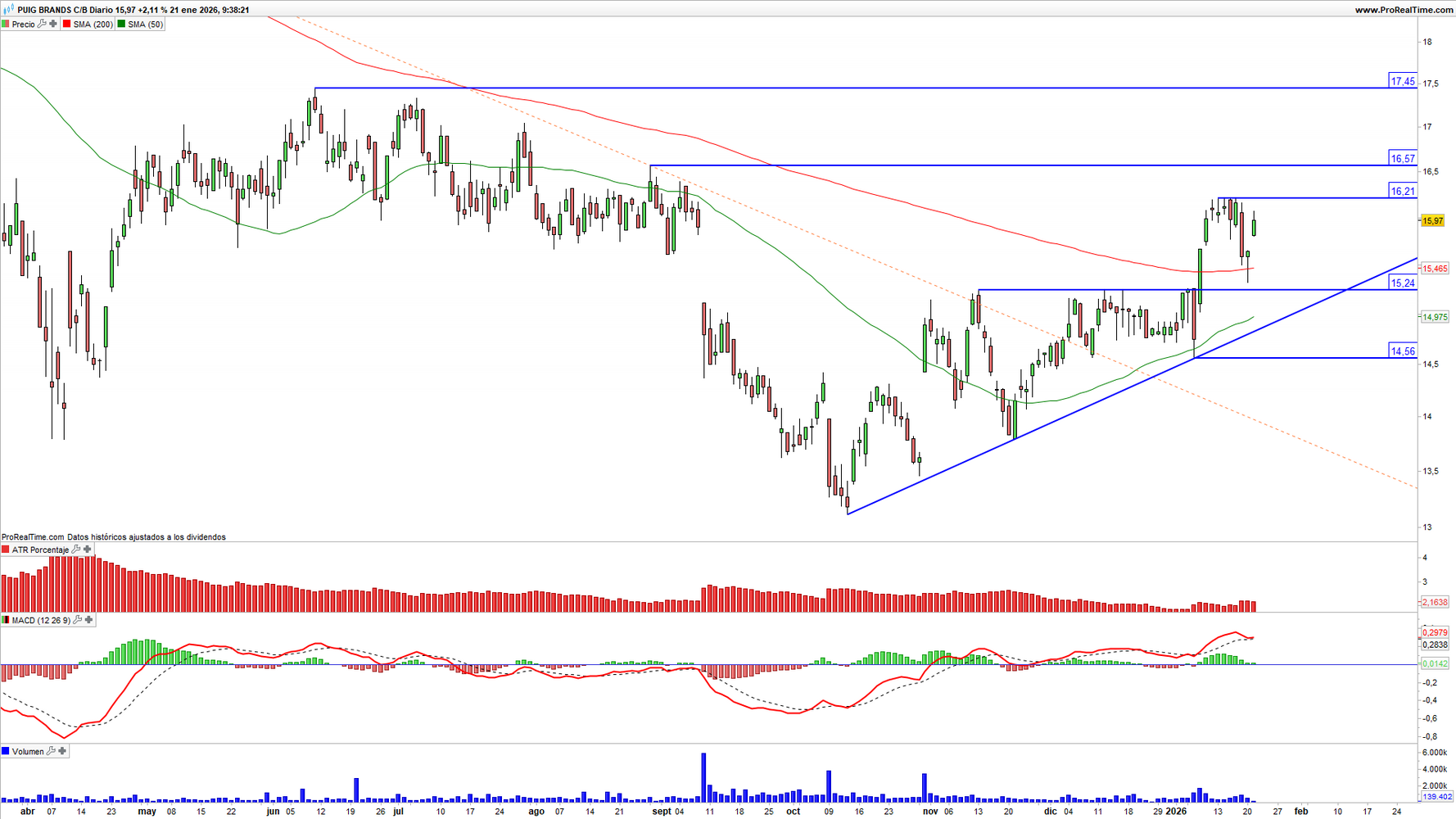 La cotización de Puig Brands arranca la jornada liderando las subidas en el Índice Ibex35 con subidas superiores al 2%. De este modo, el precio se aproxima a atacar niveles de resistencia que proyectamos a partir de los 16,21€ por acción siendo estos los últimos máximos producidos en la tendencia alcista iniciada desde los mínimos de mediados del pasado mes de octubre.