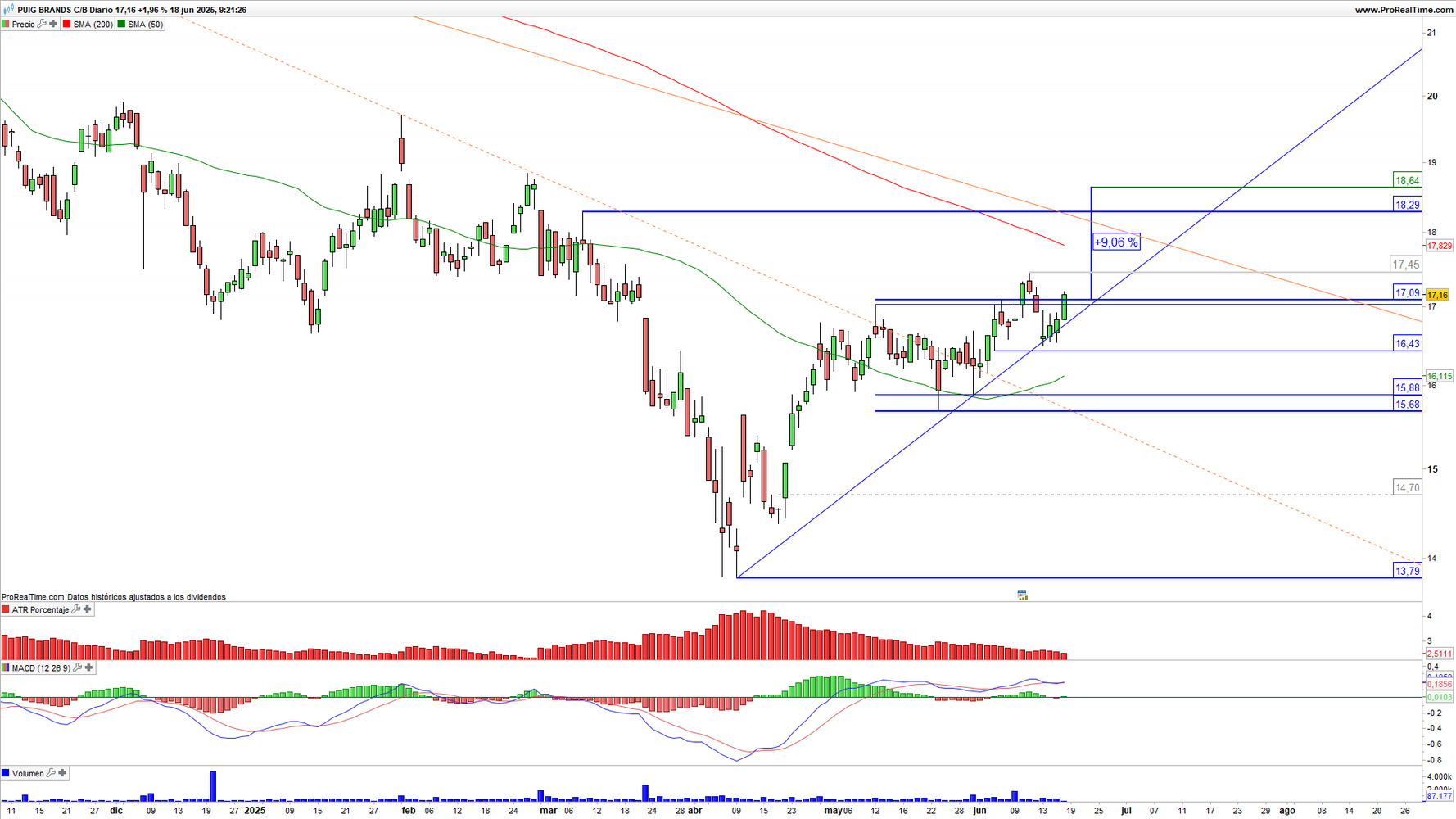 La cotización de Puig Brands inicia la sesión del miércoles con importantes subidas, rondando en estos momentos el 1,80% de ganancias. En este sentido, el activo mantiene un objetivo alcista activo, puesto que, recientemente se ha producido la superación de un rango lateral comprendido entre los 15,68 y los 17,09€ por acción, de modo que, es importante que, en la sesión de hoy volvamos a asistir a un cierre diario por encima de los 17,09€ por acción.