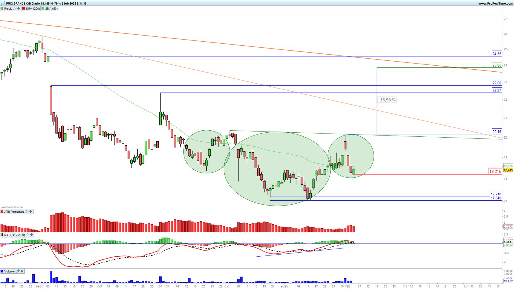 De este modo, si el precio produce una vuelta al alza durante las próximas sesiones y completa un cierre diario por encima la neckline o línea clavicular, entraría en juego un importante objetivo alcista en las acciones de Puig Brands, con una proyección de ascenso mínimo teórica de un 18,58% aproximadamente, en las inmediaciones de los 23,85€ por acción, por lo que mantendremos la vigilancia en la cotización de Puig Brands durante las próximas sesiones / semanas.