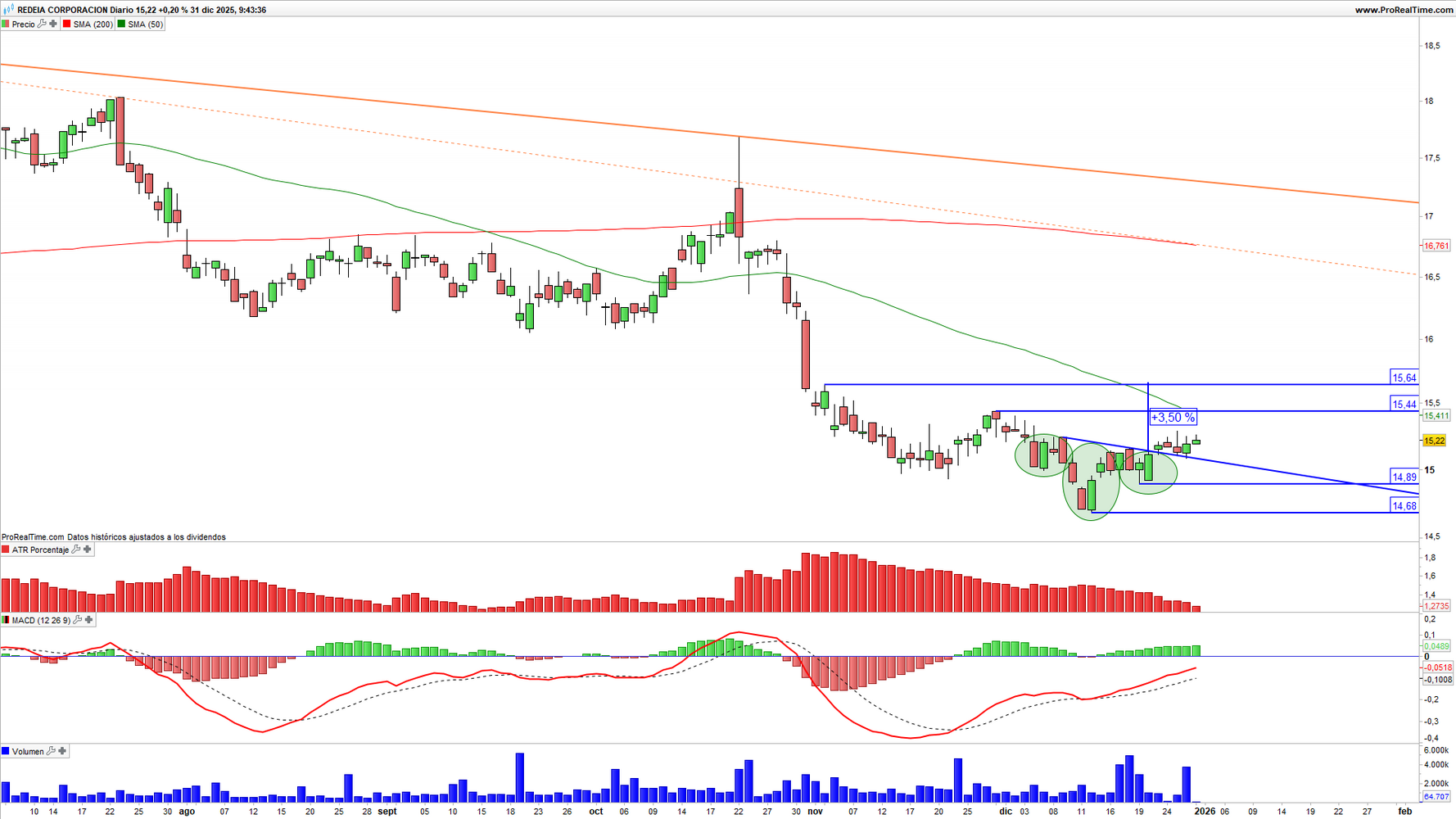 Redeia (RED) en escala diaria con volatilidad (gráfico central superior), MACD (gráfico central inferior) y actividad de contratación (ventana inferior). Fuente: ProRealTime y elaboración propia.