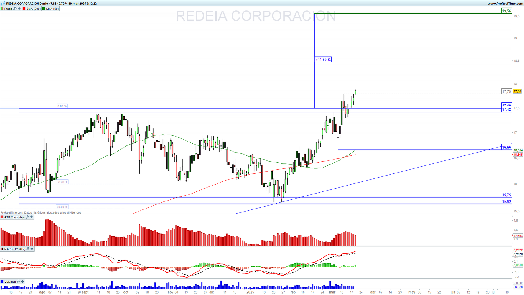 En el gráfico diario de la cotización de Redeia (REE),podemos observar que, el activo se encuentra completando un movimiento throwback en los primeros minutos de sesión, puesto que, tras producir el precio en las sesiones previas la superación de un importante nivel de resistencia comprendido entre los 17,42 y los 17,49€ por acción, hemos observado como el precio ha retrocedido y, tras encontrar un soporte en las proximidades de los niveles de resistencia superados, el precio está produciendo la superación del último máximo creciente, nivel proyectado a partir de los 17,79€ por acción.