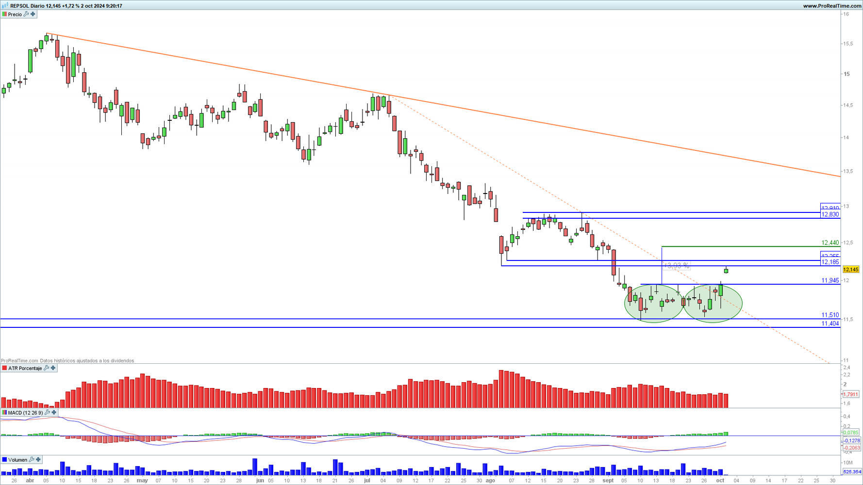 Repsol (REP) en gráfico diario con Rango de amplitud medio en porcentaje (ventana superior) MACD (ventana central) y volumen de negociación (ventana inferior)
