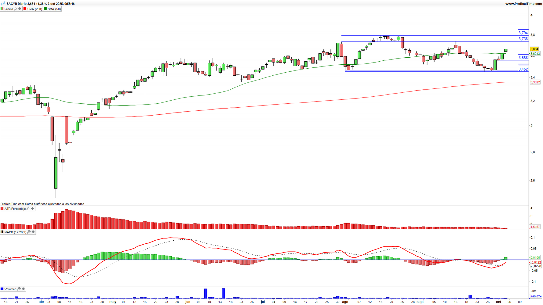 Sacyr (SCYR) en escala diaria con volatilidad (gráfico central superior), MACD (gráfico central inferior) y actividad de contratación (ventana inferior). Fuente: ProRealTime y elaboración propia.