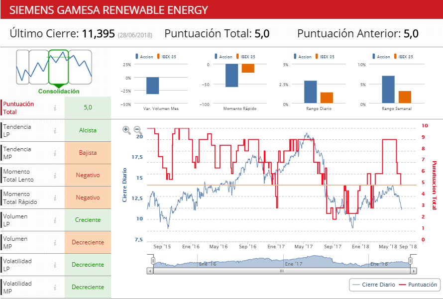 Siemens Gamesa en gráfico diario con Rango de amplitud medio en porcentaje (ventana central superior), MACD (ventana central inferior) y volumen de contratación (ventana inferior)