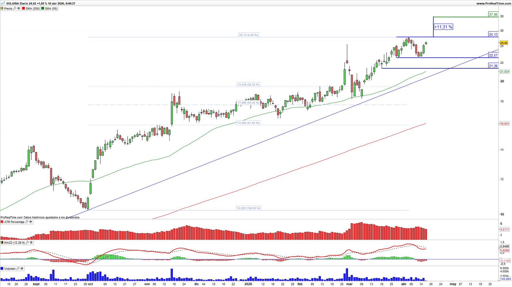 Solaria (SLR) en escala diaria con volatilidad (gráfico central superior), MACD (gráfico central inferior) y actividad de contratación (ventana inferior). Fuente: ProRealTime y elaboración propia.