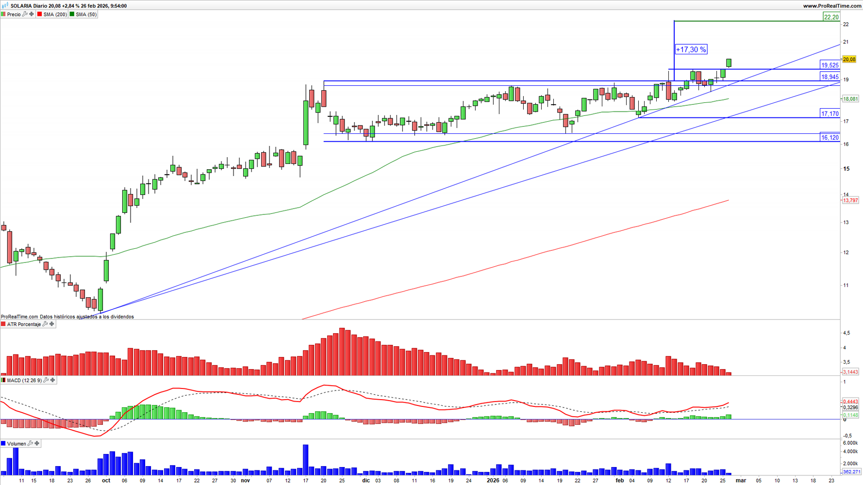 Solaria (SLR) en escala diaria con volatilidad (gráfico central superior), MACD (gráfico central inferior) y actividad de contratación (ventana inferior). Fuente: ProRealTime y elaboración propia.